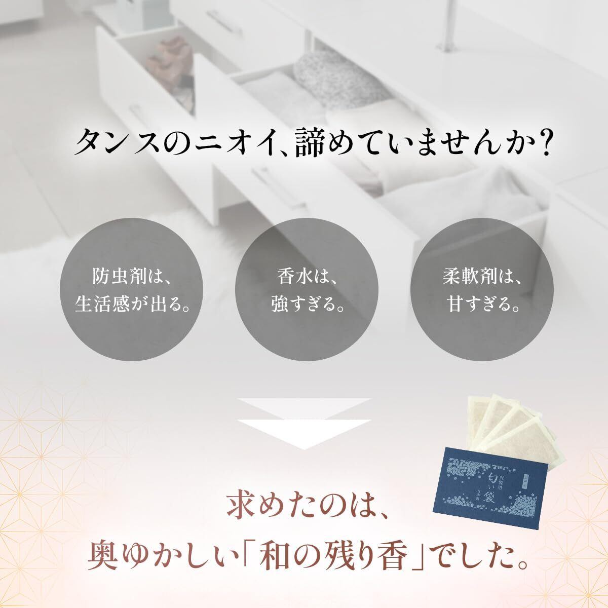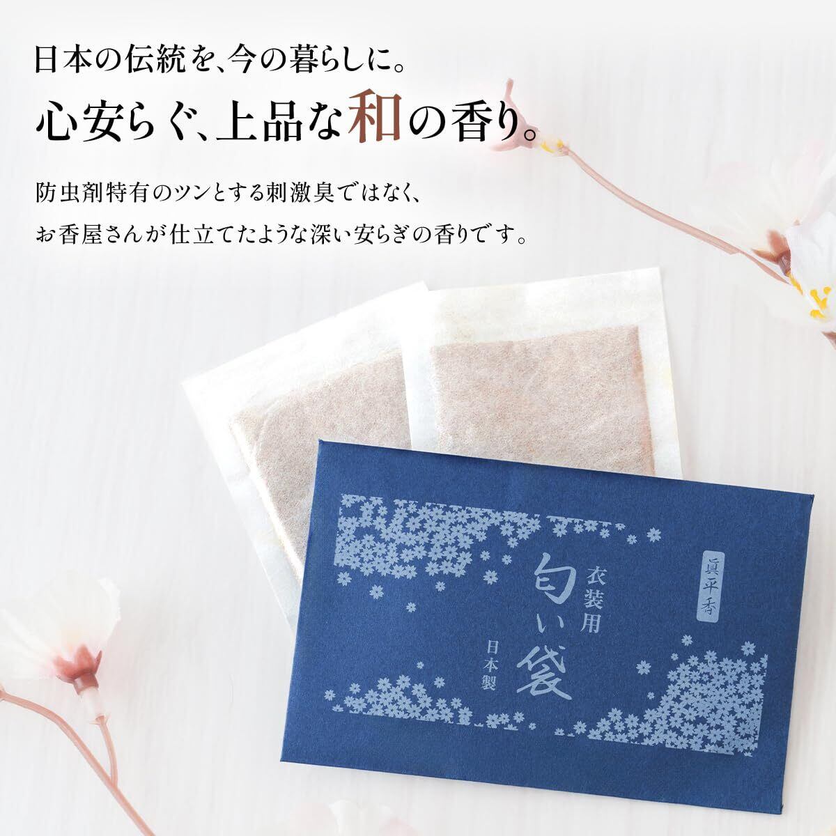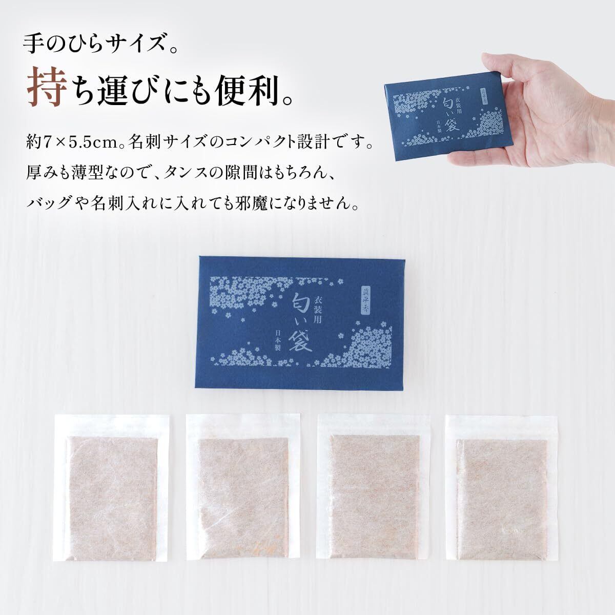 タンスなどに入れて衣装に和の香りをほのかに纏わせます。 心地の良い上品な和の香りです。 内容量:4個入り 製造:日本 ※衣類の上に直接置かないで下さい。