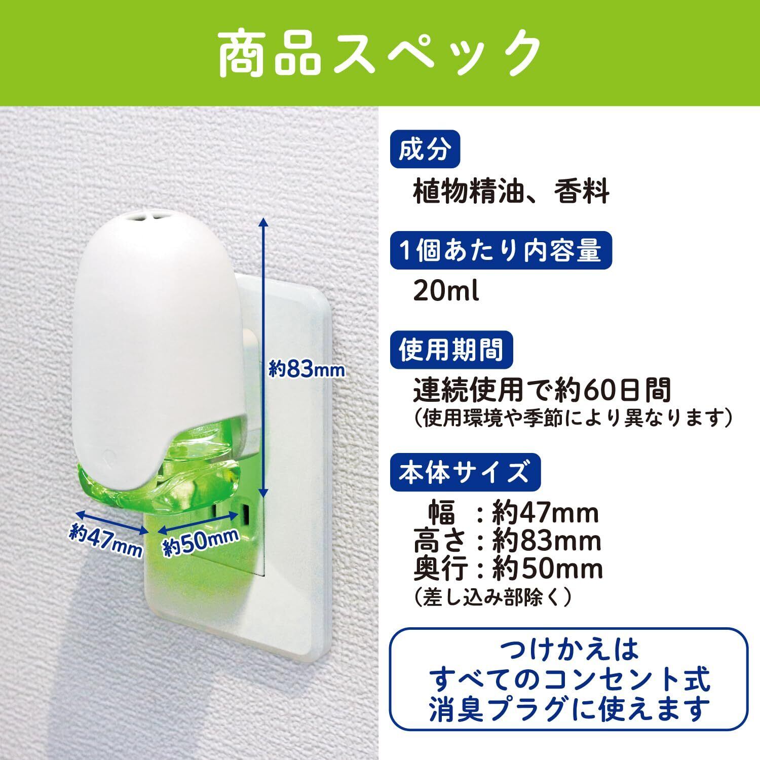 ●電子パワーでLDKなどの広いお部屋(約16畳まで)を部屋一面24時間しっかり消臭します。≪br≫●連続使用で約60日間効果が持続します。(使用環境や季節によって異なります)≪br≫●つけっぱなしでも1ヵ月の電気代はわずか約30円と経済的です。≪br≫●残量が見やすい緑色のLEDライトつきです。≪br≫≪br≫