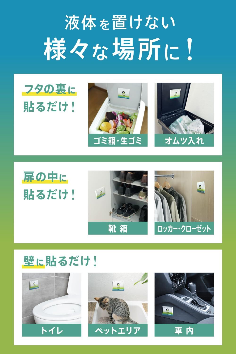 液体が置きにくいゴミ箱、オムツ箱のフタに貼り付けるだけで、消臭・脱臭・匂い消しができます。業務用として、清掃業者様、消臭サービス施工業者様などプロにも利用されている実績のある商品です。