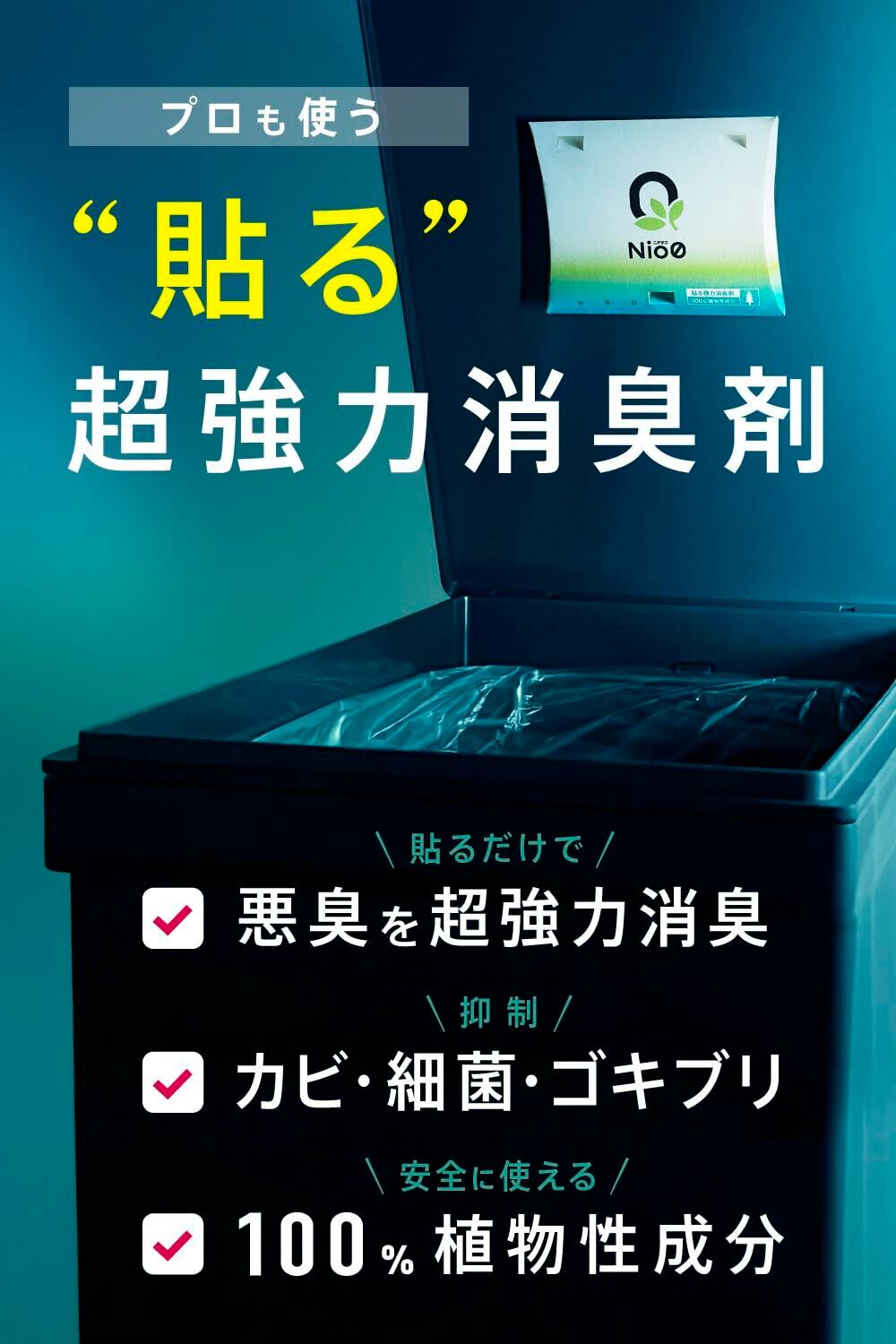 業務用でプロも使う超強力かつ安全性の高い貼る消臭剤です。ゴミ箱、生ゴミ、オムツ箱の悪臭も、ニオイの元から分解、根本から消臭します。