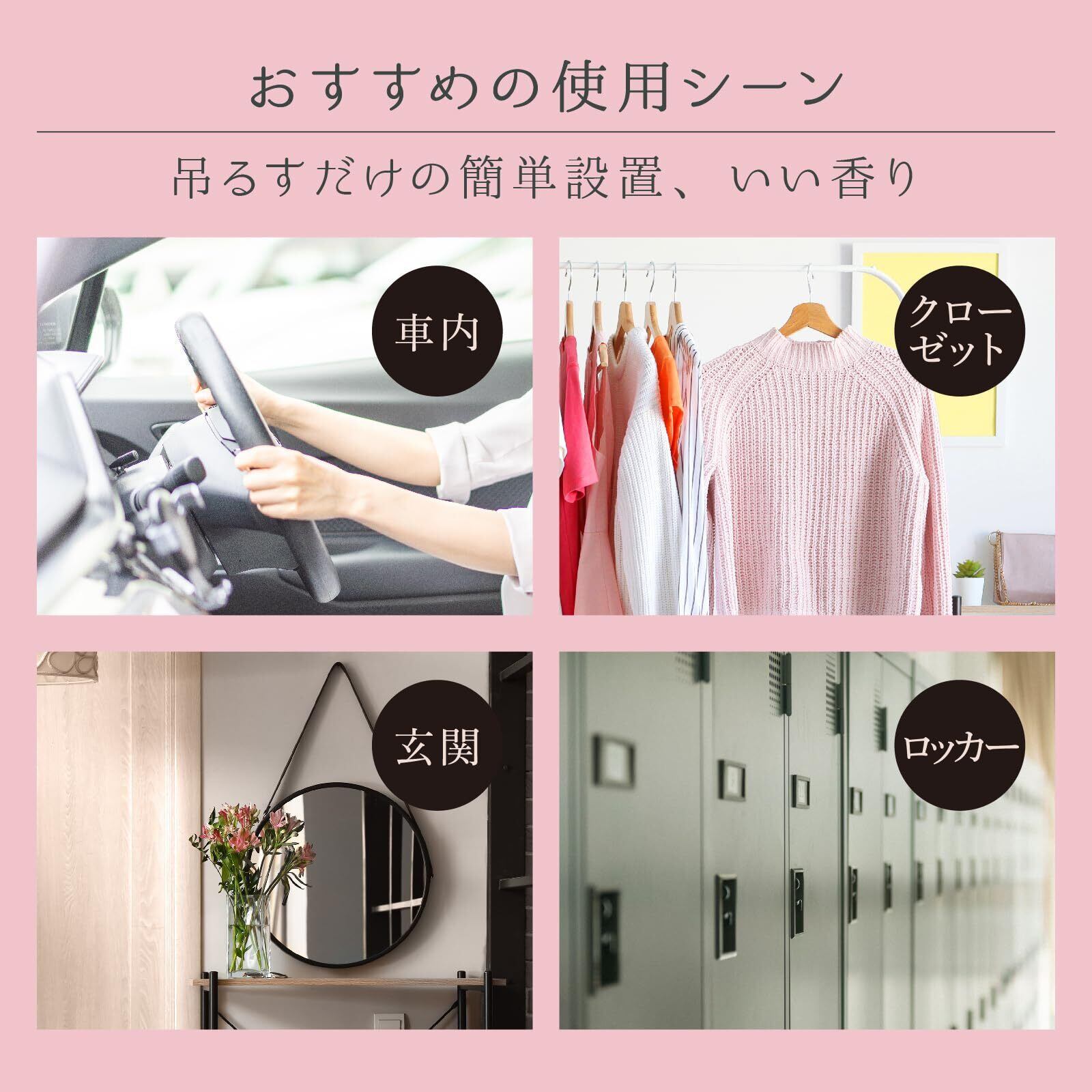 車の車内や玄関、クローゼット、ロッカーなどの狭い空間に吊り下げて使うと香りを楽しみやすいペーパータイプのルームフレグランス