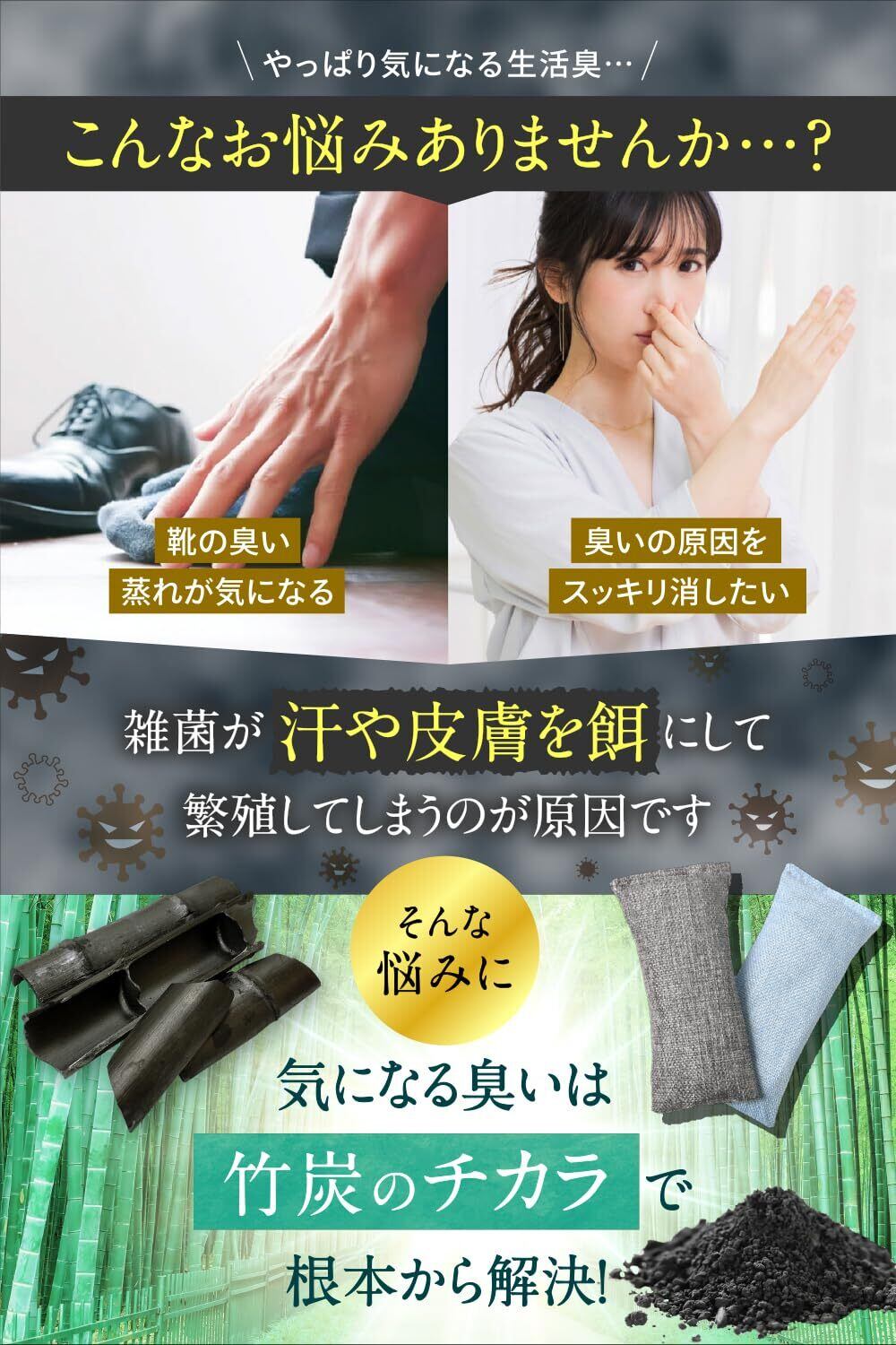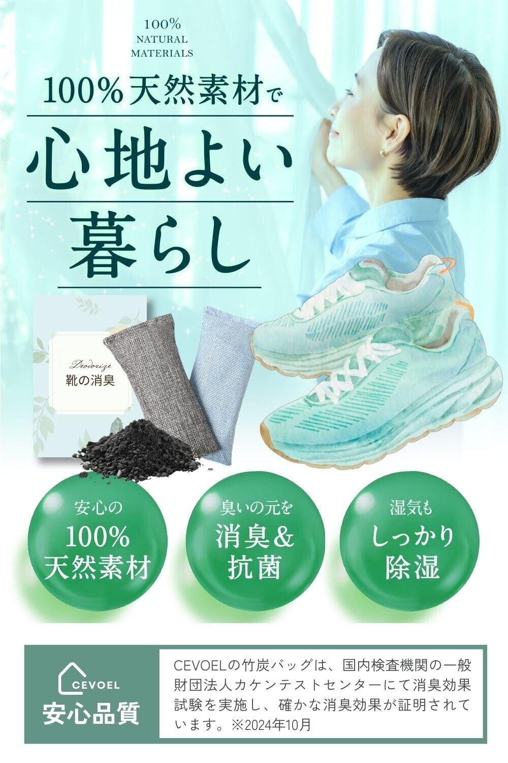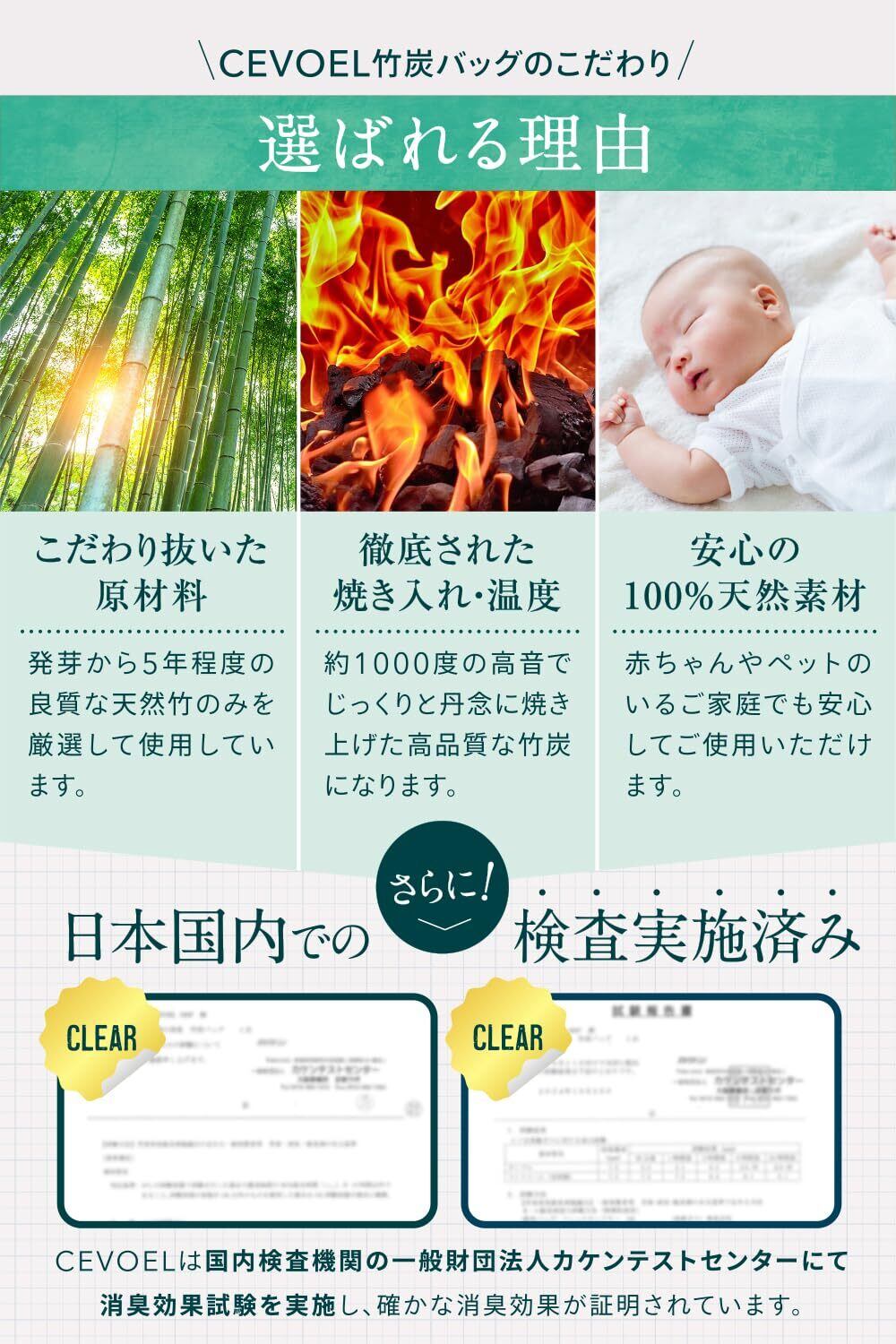 【高品質な竹炭を厳選】CEVOELの竹炭バッグは優れた 消臭 脱臭 除湿 効果を発揮する厳選された高品質の竹炭を使用しています。木炭や備長炭の10倍の吸着力で気になる臭いの元を根本から除去します。