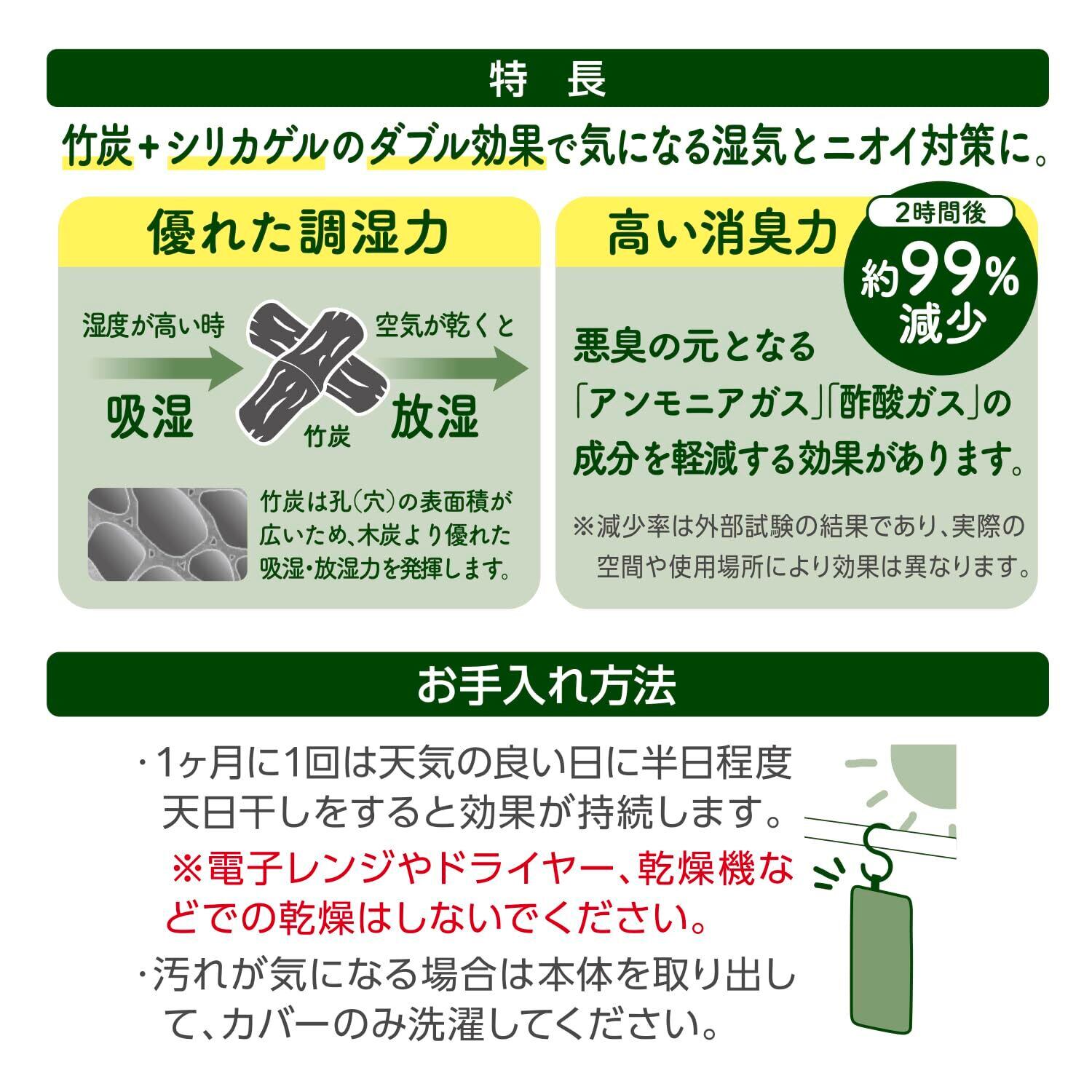 素材:本体:(内容物)竹炭・B型シリカゲル、(不織布)ポリプロピレン・ポリエステル、カバー:ポリエステル
