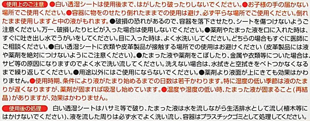 ●白い透湿シートは使用後まで、はがしたり破ったりしないで下さい。●お子様の手の届かない所でご使用下さい。●容器に物をのせたり倒れたままでの使用はさけ、必ず平らな場所でご使用下さい。倒れたまま使用しますと中の液がもれます。●破損の恐れがあるので、容器を落下させたり、シートを傷つけないようご注意下さい。万一、破損したりヒビが入った場合は使用しないで下さい。●薬剤やたまった液を口に入れたときは、すぐに吐き出し水でうがいをして下さい。目に入った時は、よく水洗いして下さい。どちらの場合もすぐに医師にご相談下さい。●白い吸湿シートに衣類や皮革製品が接触する場所での使用はお避け下さい。(皮革製品には液や薬剤を絶対につけないようにご注意下さい)●たまった液や薬剤をこぼしたり、金属や衣類等についた場合は、サビ等の原因になりますのでよく水で洗い流して下さい。洗えない場合は、水拭きと空拭きをベトつかなくなるまで繰り返して下さい。●用途以外に使用しないで下さい。●薬剤より液面が上にきても効果はかわりません。●使用時期、条件により液がたまり始めるまでの日数は若干かわります。特に湿度の低い季節は液のたまりが遅くなりますが、薬剤が固まれば吸湿し始めています。●温度や湿度の低い時、たまった液が固まること(再結晶)がありますが、効果はかわりません。