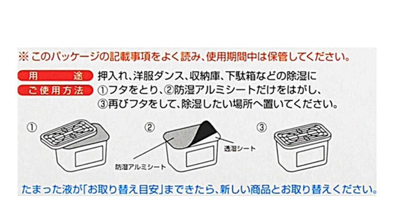お得な除湿剤です! 押入れ、洋服ダンス、収納庫、下駄箱などの除湿に。パラジクロルベンゼン、ナフタリンなどの成分の異なる他の防虫剤と一緒に使えるニオイがつかないタイプの除湿剤です。金糸、銀糸、ラメ加工製品、毛皮、皮製品などにも使えます。たまった液が「お取り替え目安」まできたら、新しい商品とお取り替えください。