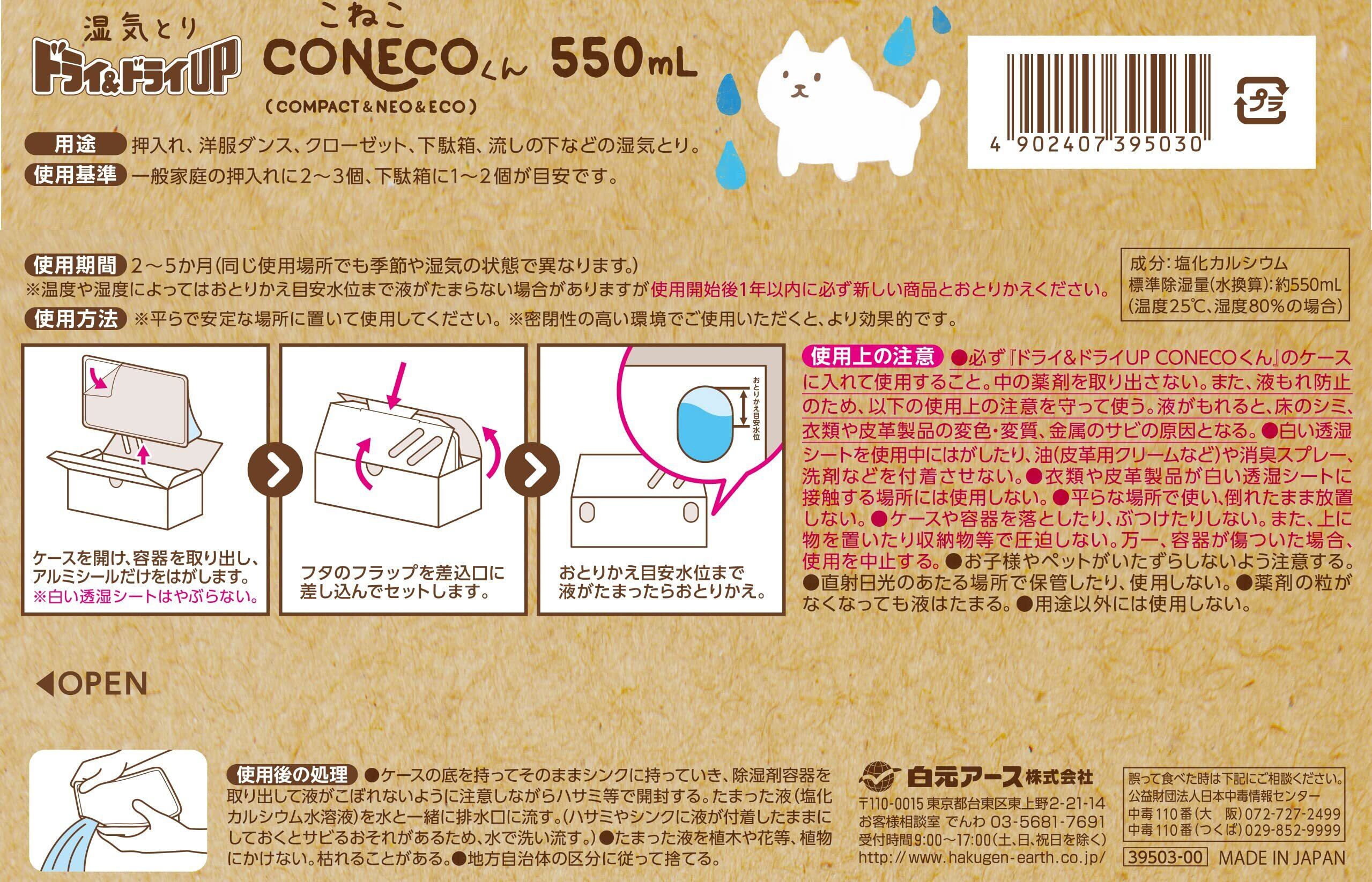 ドライ&ドライUP CONECOくん 550mL 2個入 ネコ 除湿剤 無香 湿気取り 大容量 コンパクト 省ごみ設計 押入れ クローゼット 白元アース