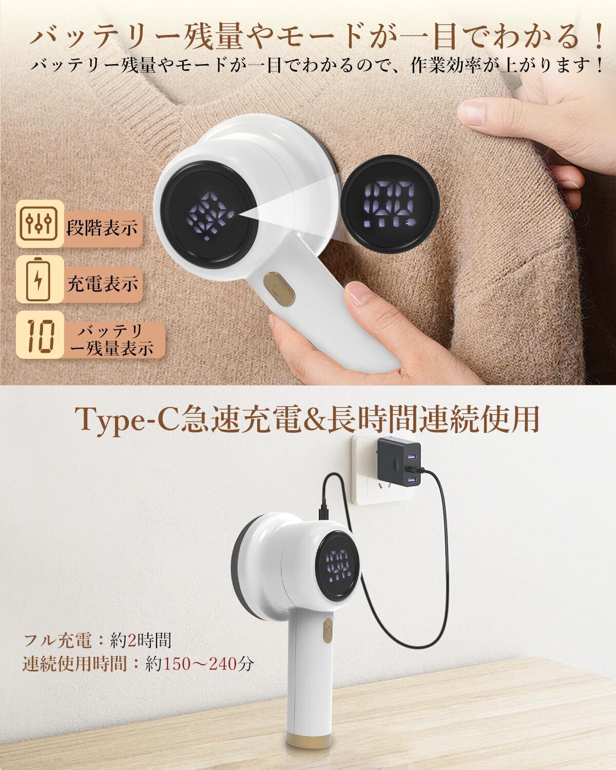 【LED 液晶ディスプレイ & Type-C急速充電】毛玉取り器は LED ディスプレイを搭載し、 電池残量 / 段階モード が 一目瞭然 分かります!使用中に突然電池が切れたり、残量が分からなくなる心配はありません。Type-C 急速充電設計により、どこでも簡単に充電できます。電池が切れても電源コードを接続すればそのまま使用可能で、旅行先や自宅での使用に最適です。