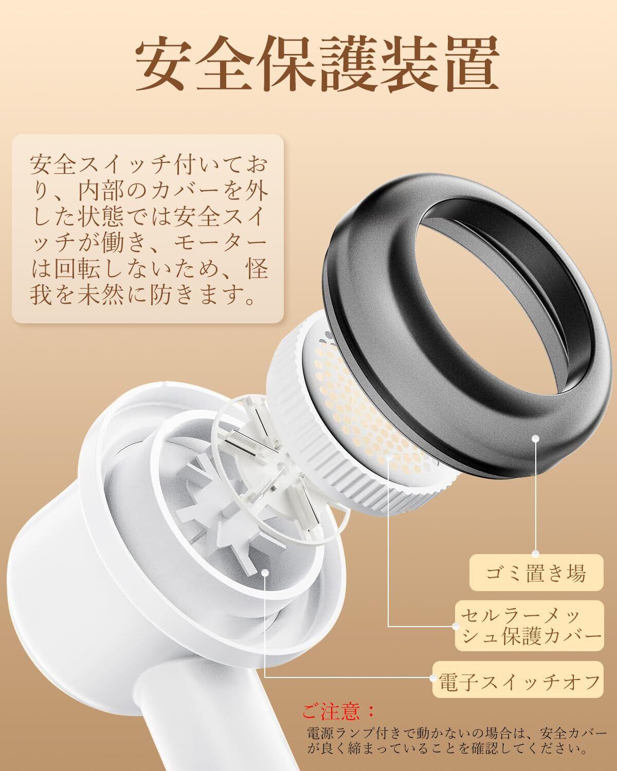 【安全保護装置】高密度ハニカム状の滑らかなステンレスメッシュが、刃と衣類を効果的に隔離し、生地表面を優しく保護します。同時に誤操作防止の安全ロックを備え、蓋が外れたり、ゴミ箱が満杯になったり、装置が過熱したりした場合には自動的に停止し、安心して使用できます。