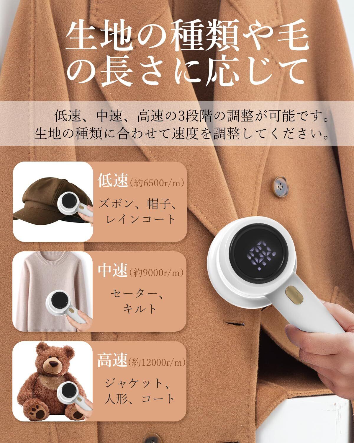 【3 段階モード調節・様々な生地に対応】生地の種類と毛足の長さに合わせて、毛玉取り器の回転数を低-中-高の 3 段階で調節できます。衣類のみならず、ぬいぐるみや寝具、ソファなど幅広く使用可能です。精密な回転数制御と安全カッター網により、「1 台で万能」を実現します。多くの主婦にとって心強い助っ人です!