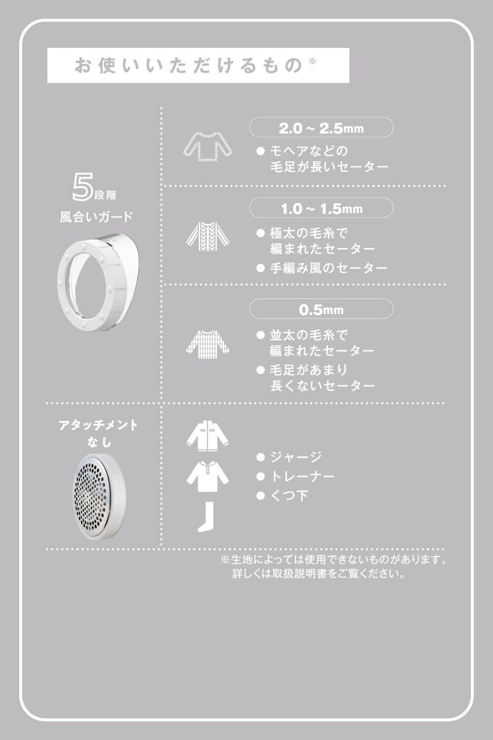 風合いガードは5段階で調整できて、仕上がりを0.5mm~2.5mmまで0.5mmごとに変えられます。生地に応じて残したい毛足の長さを変えられるから、気になる部分だけをカットしてきれいな仕上がりに。