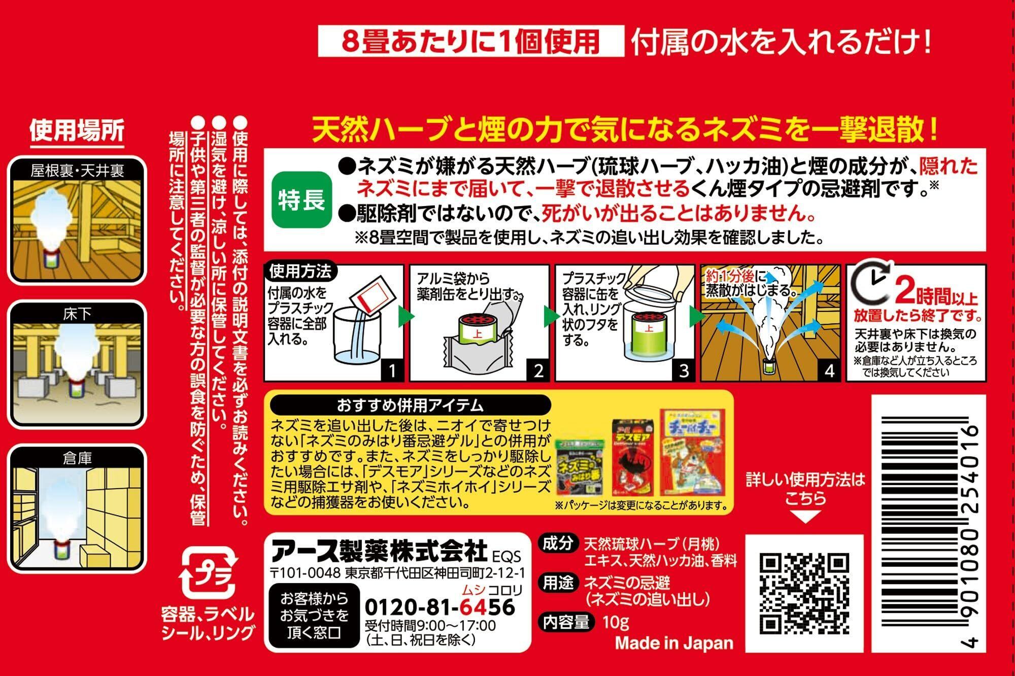 ・ネズミが嫌がる天然ハーブ(琉球ハーブ、ハッカ油)と煙の成分が、隠れたネズミにまで届いて、一撃で退散させるくん煙タイプの忌避剤です。※8畳空間で製品を使用し、ネズミの追い出し効果を確認しました。