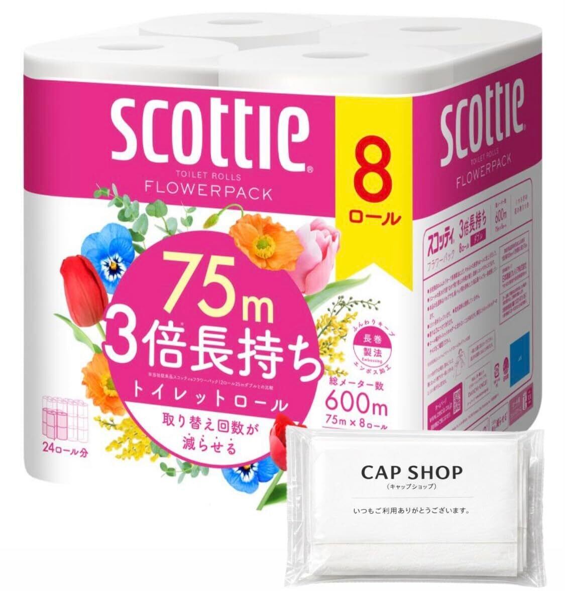 スコッティ フラワーパック 3倍長持ち ダブル 75m×8ロール + オリジナルポケットティッシュ付 セット