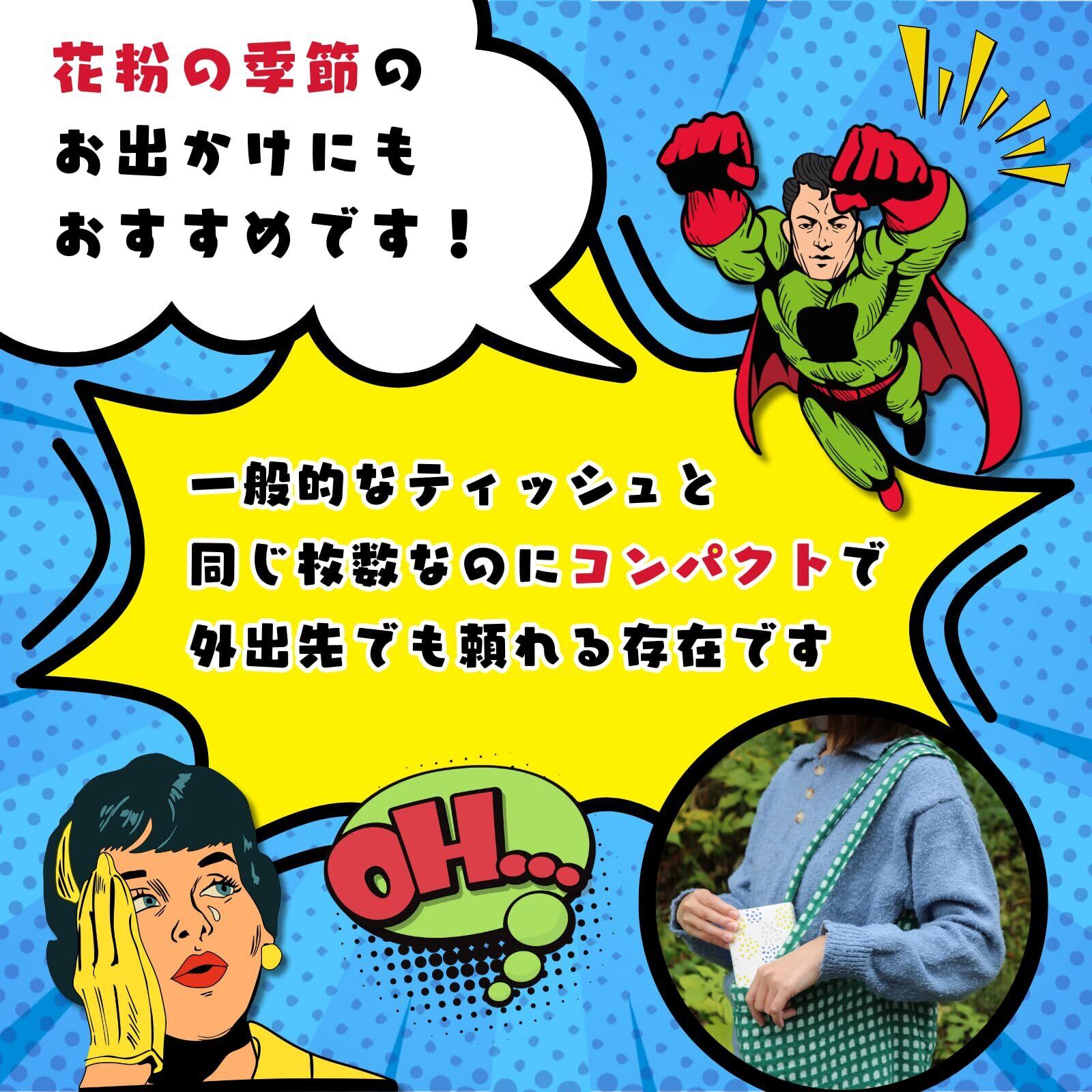 【特徴】箱をなくした省スペース設計のティッシュ ソフトパック。柔らかな質感で使いやすく、オフィスやご家庭の常備用にも最適です。一般的なティッシュペーパーやソフトティッシュと同様に、日常のあらゆるシーンでお使いいただけます。