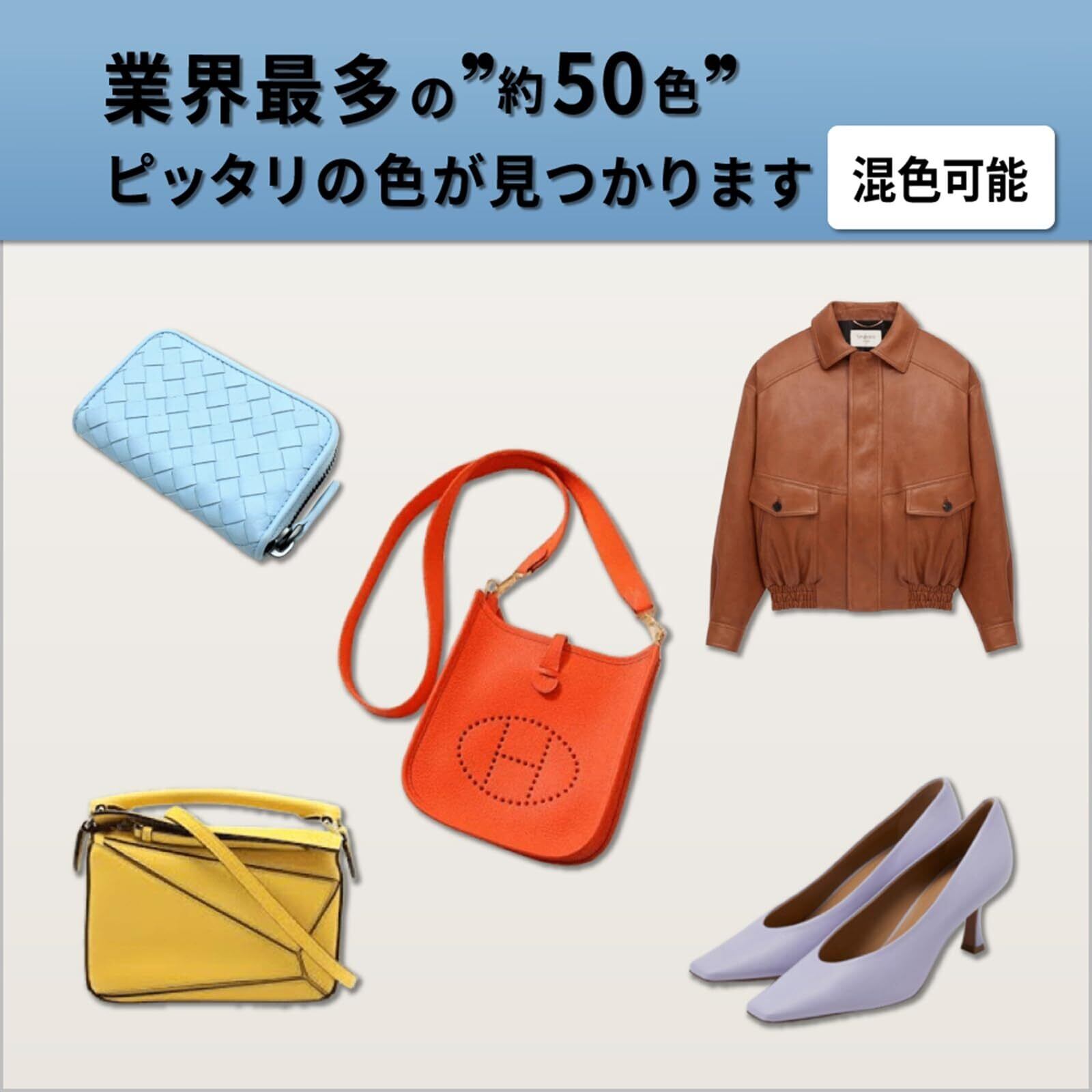 乾いた後はベタつかず、衣服などへの色移りがないのでバッグ、革財布、ベルト、ソファ、革ジャケット、革ジャン、車のシート、レザーハンドルなどにも使用できます。