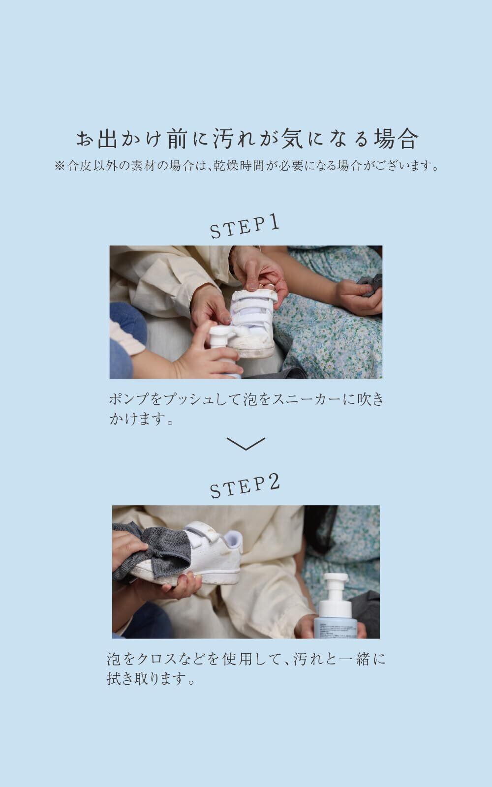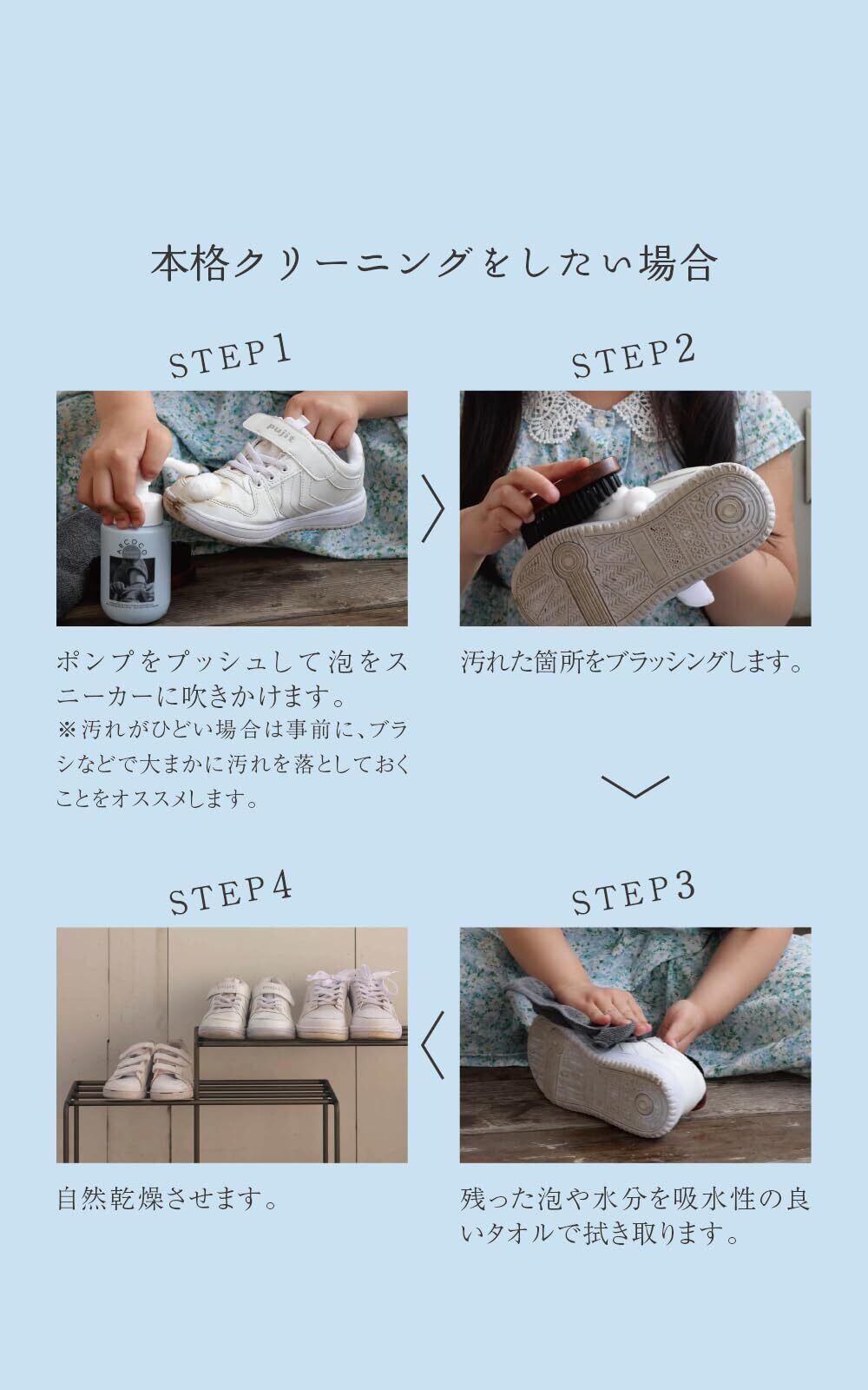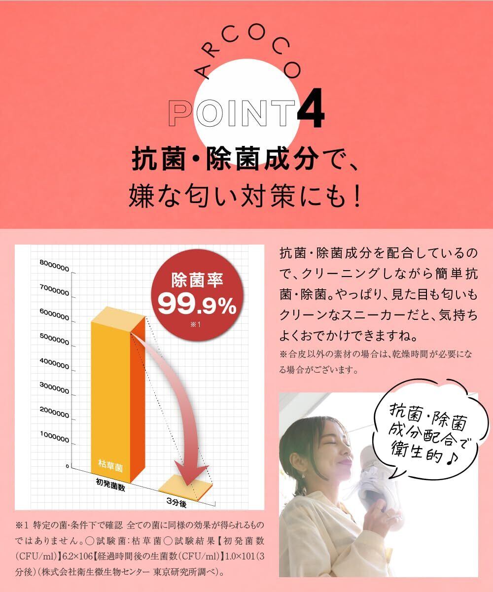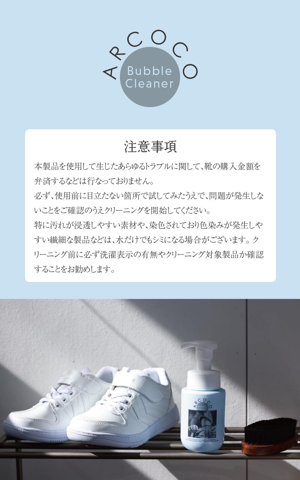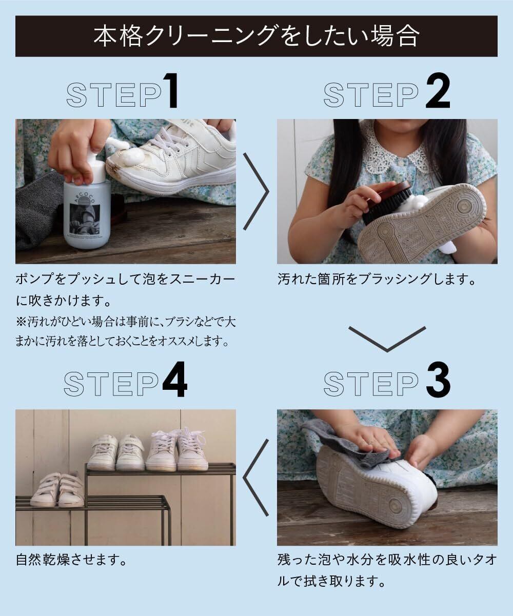 ■ARCOCOが選ばれる4つの理由 Point.1:素材へのこだわり ARCOCOは、ベビーシャンプーや敏感肌用の製品等にも使われる、食物由来の成分でできています。 マイルドなのに優れた洗浄力を持つことが特徴です。 Point.2:手軽さ ARCOCOは最初から泡で出てくるシューズシャンプー。 毎日履く靴を、泡で洗ってタオルで拭き取るだけの簡単2ステップ。 水でごしごし擦る必要もないので、靴へのダメージは最小限に、 お気に入りの靴を長く綺麗に保ってくれます。 Point.3:除菌成分配合 ・除菌成分配合で気になる靴の臭い対策も◎ Point.4:デザインへのこだわり ARCOCOのやさしいブルーの色味は、どんなお部屋にも馴染んで 置いているだけでインテリアになるようなかわいいデザインを追求しました。