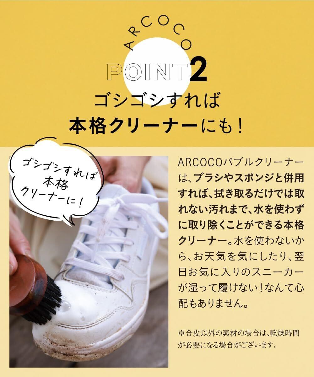 ARCOCOは洗い流さないシューズシャンプーです。 水洗い不要、ARCOCOでさっと洗ってタオルドライするだけ。 手軽で簡単だから、気軽に続けられる。 合皮や本革、スウェード素材の靴にご使用いただけます。