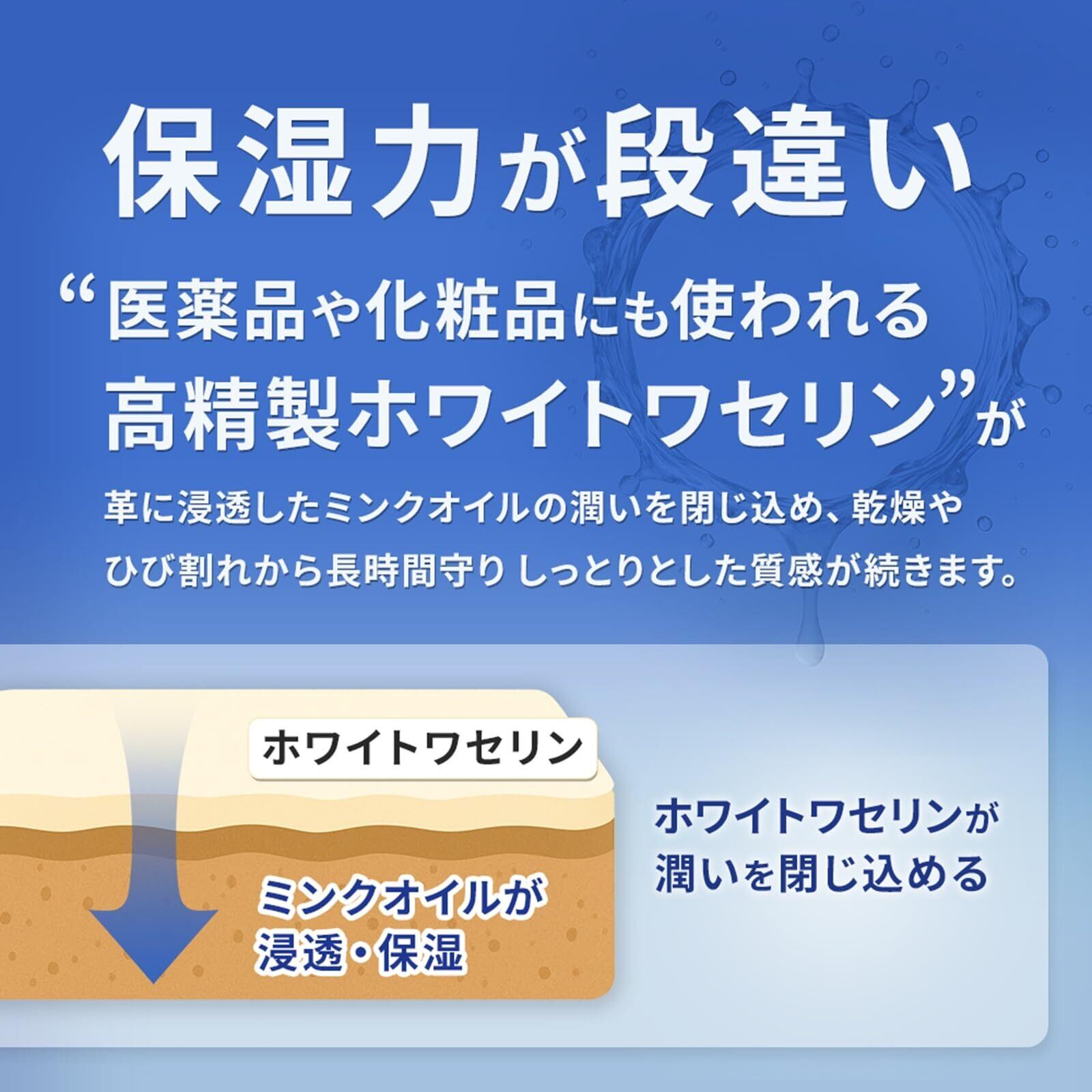 【潤いと柔軟性が復活!】浸透力の強いミンクオイルの栄養効果と、ワセリンの保湿効果で、革製品をしっとり柔らかくし、防水効果も与えます。大切な革製品を長く愛用するための必需品です。