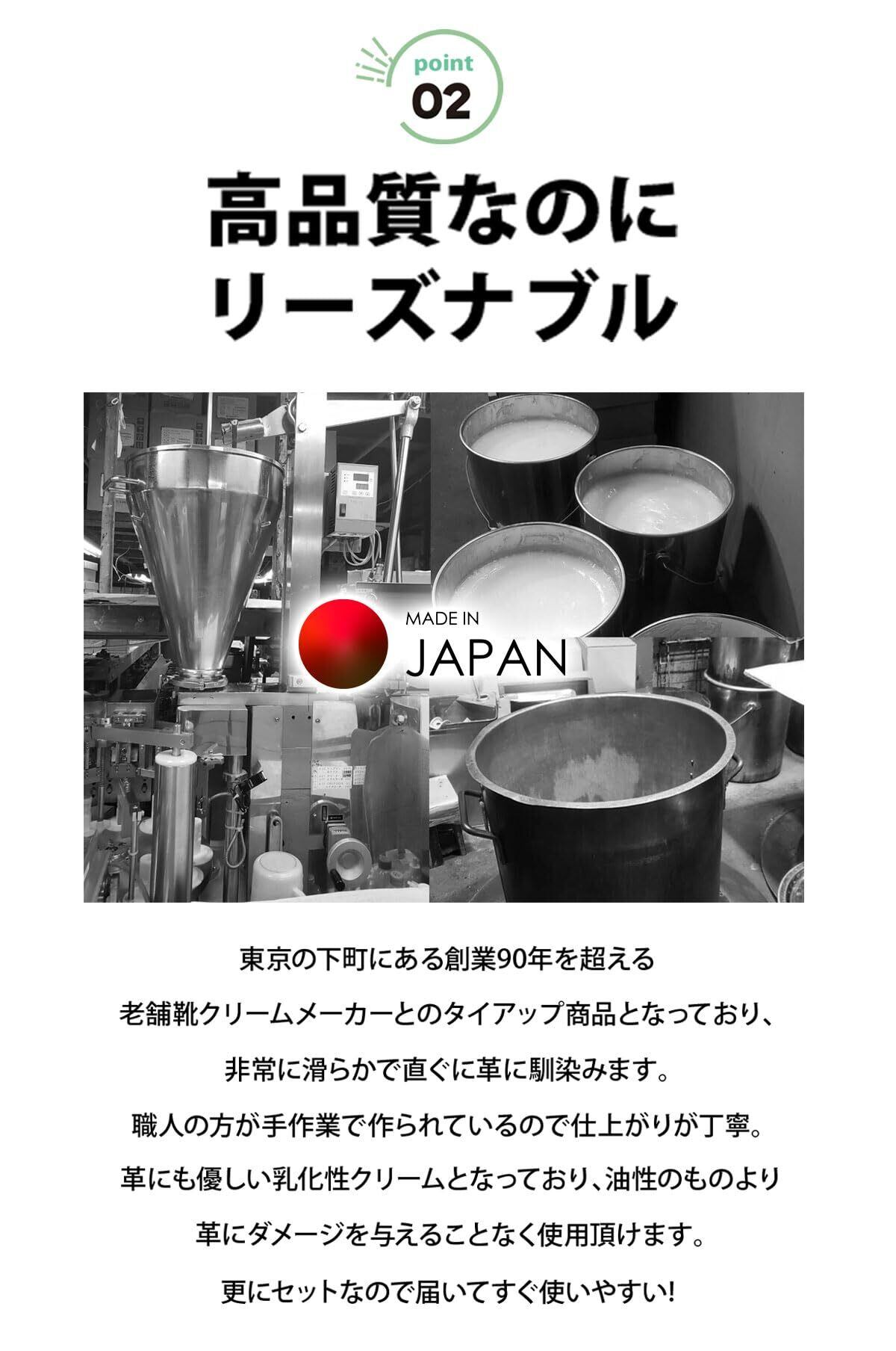 ■靴磨きがはじめての方におすすめの靴クリーム登場! ■革の表面の凹凸に合わせて極細粒子のクリームが乗るので、革本来の陰影を残し、深みのある色を引き出せます。 ■使い切りやすいサイズ感で靴クリームを余すことなく使える ■高品質なのにリーズナブル! ■豊富な色合いであなたの靴に合う色合いが見つけやすい!