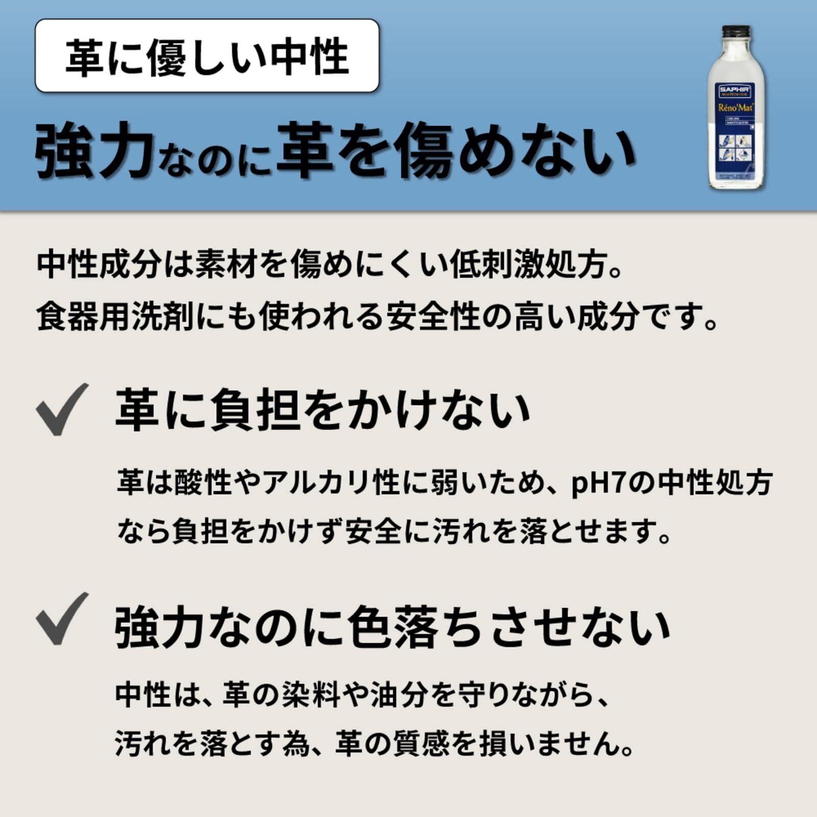 皮革専用に開発され、皮革にダメージを与えにくい中性(ph7)のクリーナーです。