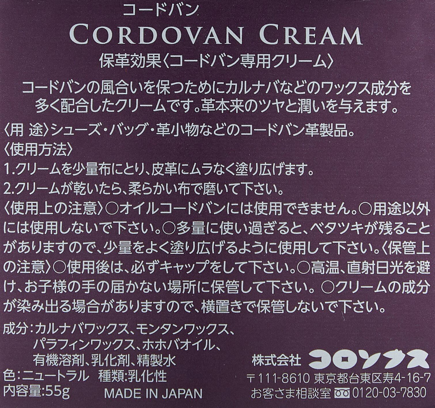 コードバンの風合いを保つためにカルナバなどのワックス成分を多く配合したクリームです。革本来のツヤと潤いを与えます。
