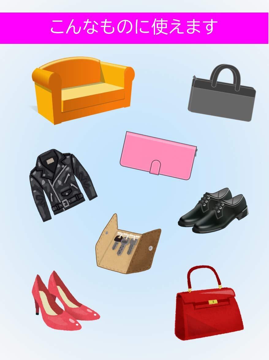 乾いた後はベタつかず、衣服などへの色移りがないのでバッグ、革財布、ベルト、ソファ、革ジャケット、革ジャン、車のシート、レザーハンドルなどにも使用できます。