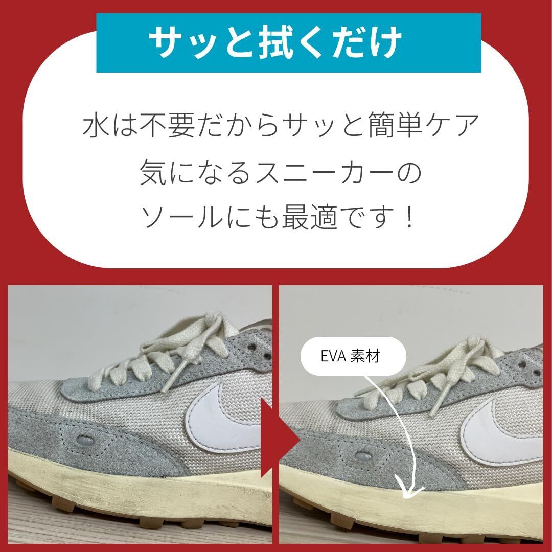 防水・防汚コート:フッ素配合のクリーニング成分が汚れを拭き取りながら、防水・防汚コーティングを付与します。約半日程度で防水効果が現れる目安で、雨や泥はねによる汚れが付着しにくくなるよう配慮しているため、スニーカー用のクリーナーをお探しの方にも使いやすい設計です。