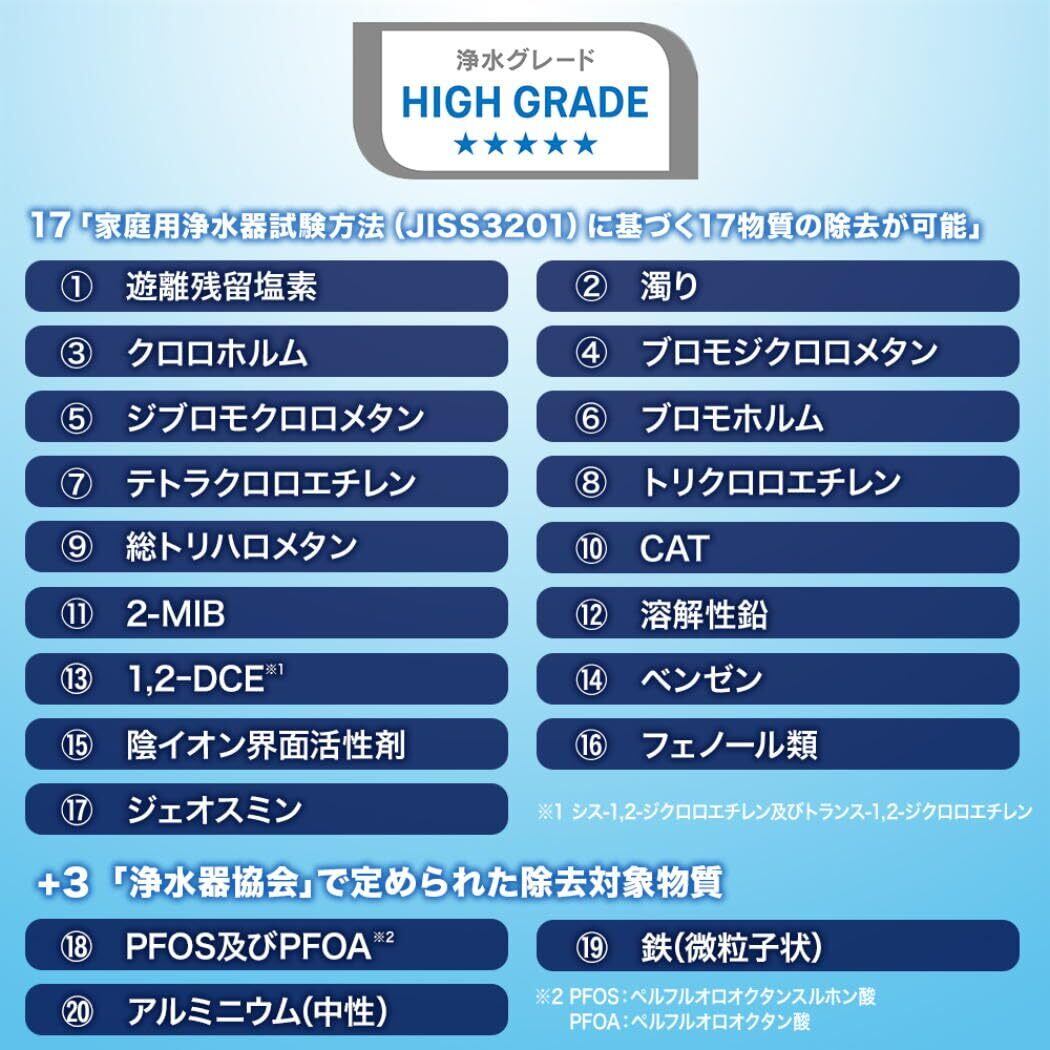 ●活性炭・イオン交換繊維・中空糸膜フィルターを組み合わせたクリンスイ独自の高性能カートリッジが、家庭用品品質表示法に定められた除去対象物質(17物質)(※1)と浄水器協会で定められた除去対象物質(2物質)(※2)を高度除去する。※1 家庭用品品質表示法に定められた除去対象17物質。※2 浄水器協会で定められた規格基準(JWPAS B.100)に挙げられている除去対象物質