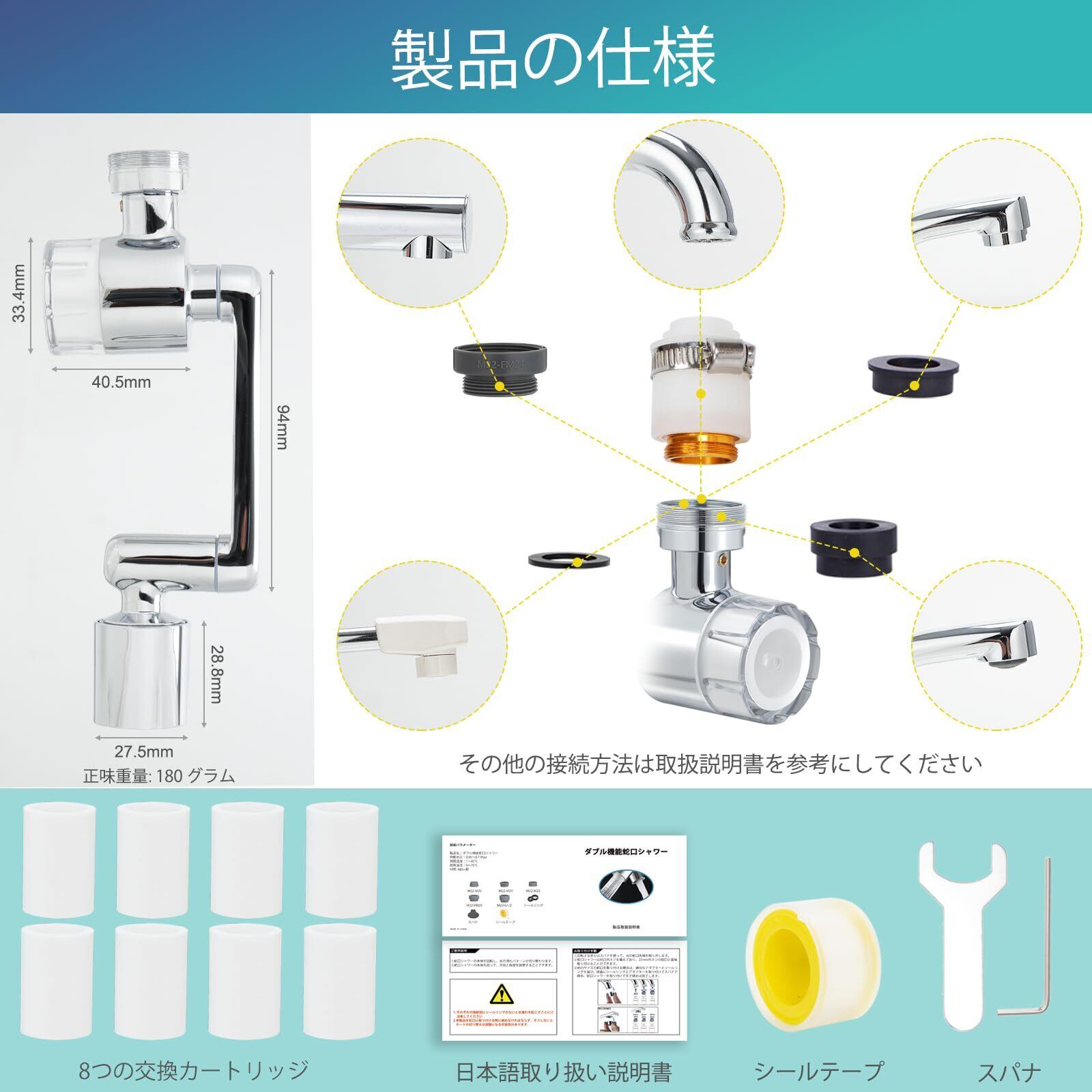 「設置簡単」蛇口の先端に接続するだけで使用でき、各種の取り付け部品と日本語のユーザーマニュアルが付属しています