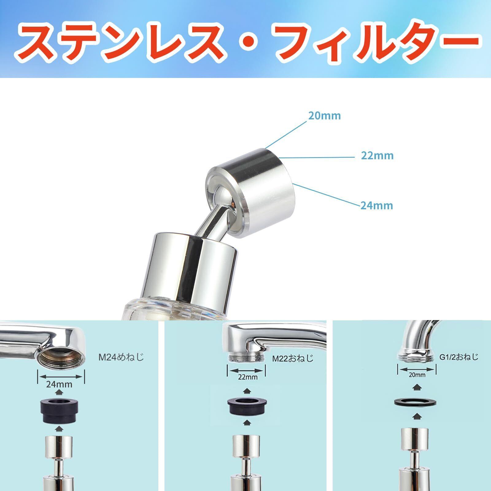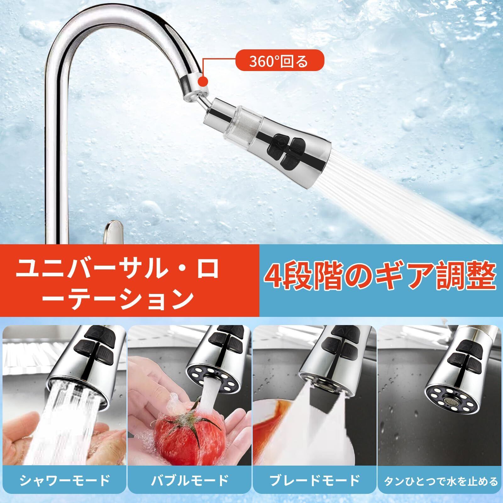 【360度自由回転】360度回転設計で、ヘッドの向き、水流の向きを自由に変えられ、延長管も吐水口の高さ位置に調節できる。あらゆる方向への水流に便利で、隅々までシャワーを浴びることができます。