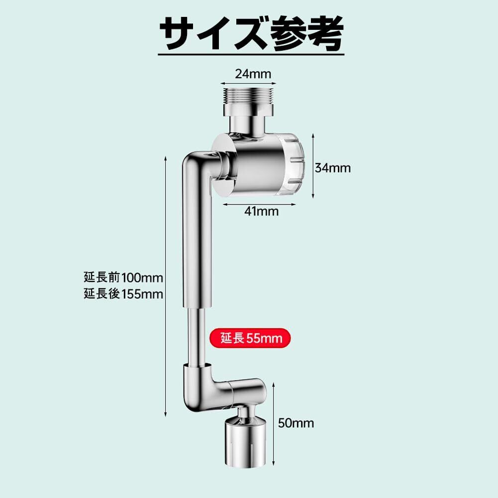 「延長パイプ追加」市販の商品より改善して、360°回転伸縮延長パイプを追加しました。最長5.5cm延長できますので、大きい洗面台でも痒い所に手が届きます。