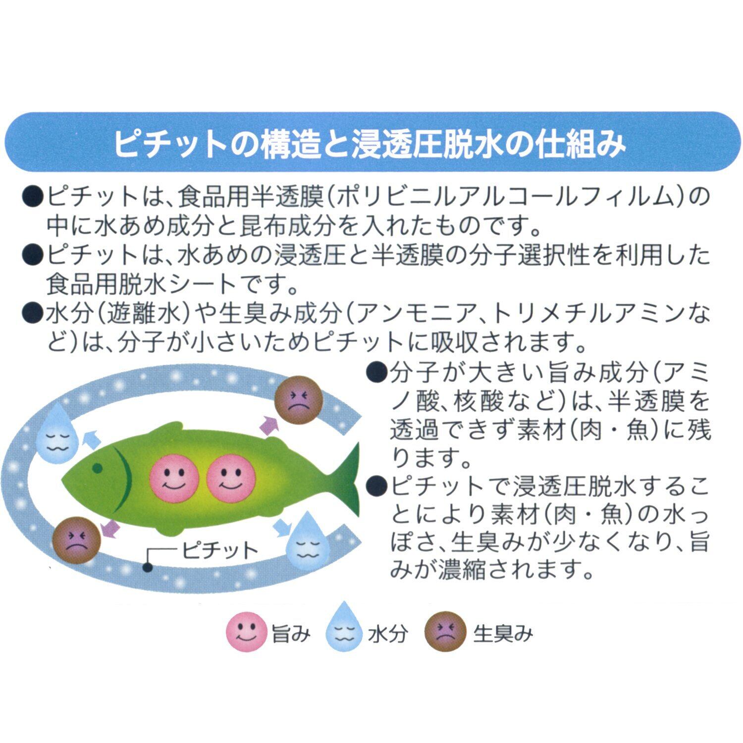 食品を包むだけで、なまものに含まれている余分な自由水を吸収するピチット
