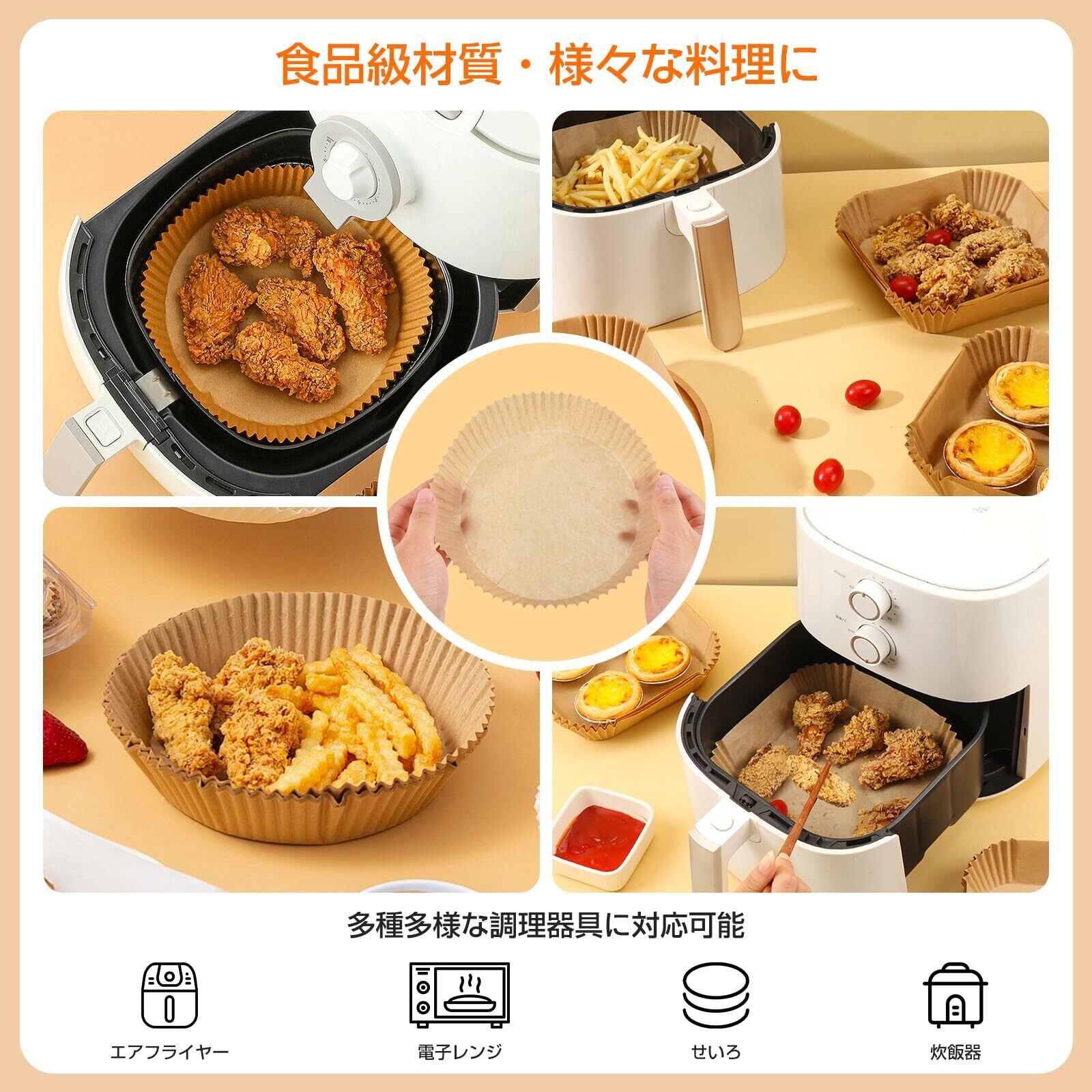 【家中の調理家電で大活躍】CCYCCLエアフライヤー用紙はエアフライヤーはもちろん、オーブン、電子レンジ、蒸し器、炊飯器など、あらゆる調理家電でお使いいただけます。揚げ物、焼き菓子、蒸し料理、温め直しまで、一枚あれば様々な調理シーンで活躍。バーベキューやキャンプのアウトドアでも便利です。