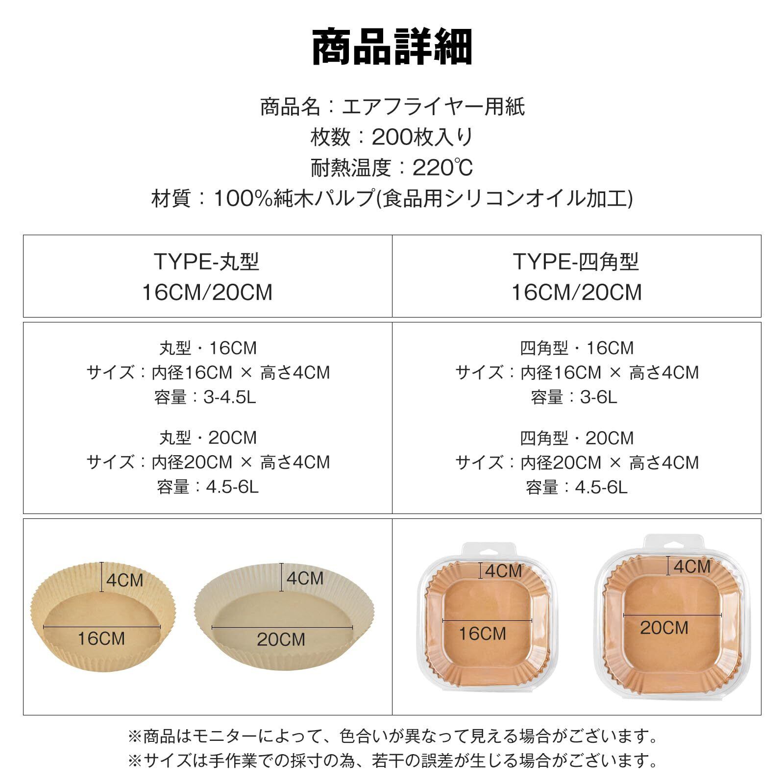 エアフライヤー用紙 200枚セット 天ぷら敷紙 ノンフライヤー あぶらとり紙 せいろ蒸しシート 揚げ物 使い捨て クッキングシート 電子レンジ/オーブン/蒸し器/エアフライヤー 対応 ノンフライヤーシート 丸型/四角型 20cm