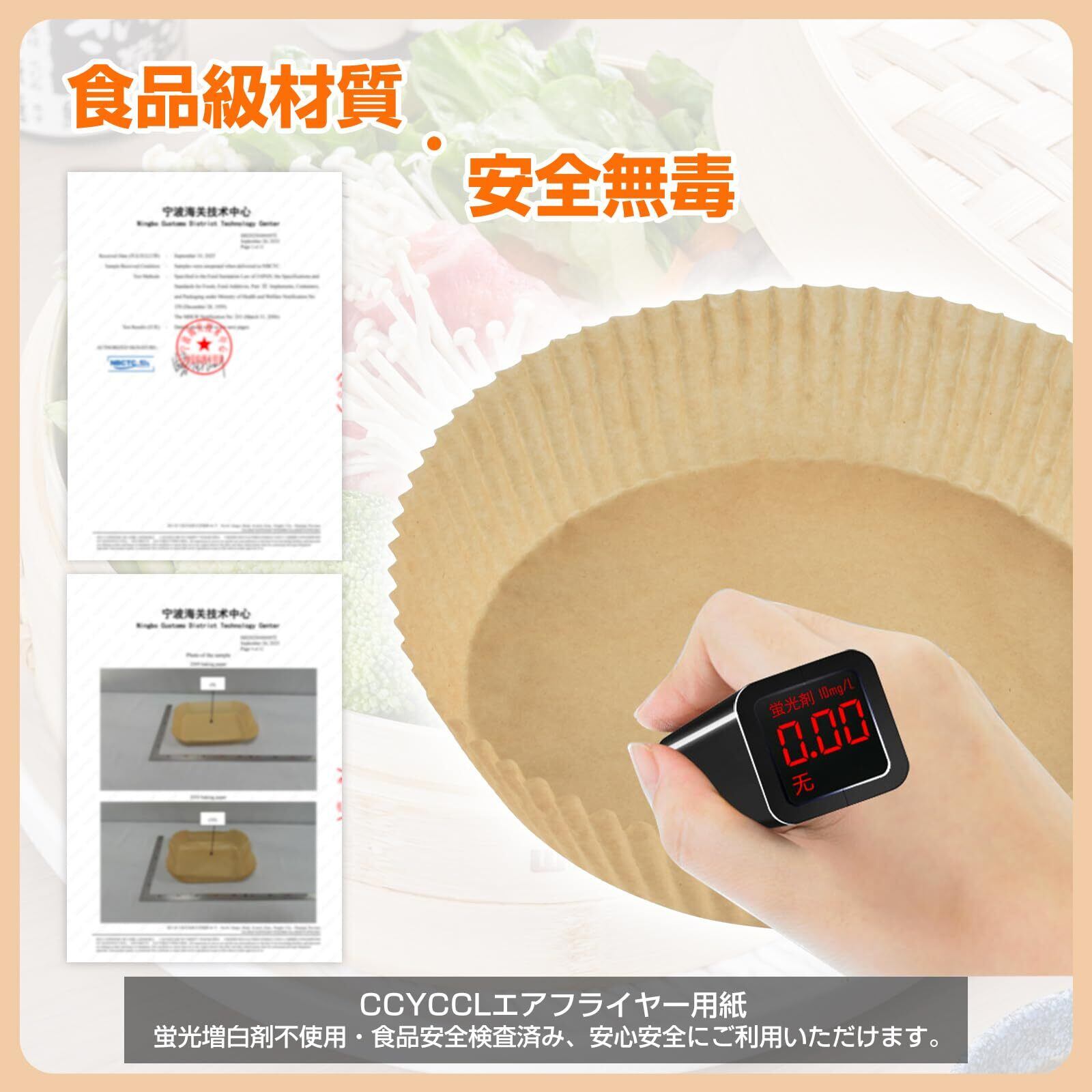 【食品級安全素材 & 優れた耐性で料理を美味しく】CCYCCLエアフライヤー用紙は食品グレードのシリコンオイル紙を採用。蛍光剤・漂白剤無添加で、安心してお使いいただけます。防水・耐油・非粘着性に優れ、油や汁もれを防ぎ、揚げ物をカラッと仕上げるのを助けます。高密度設計で破れにくく、230℃までの耐熱性で、オーブンや蒸し器でも安心です。
