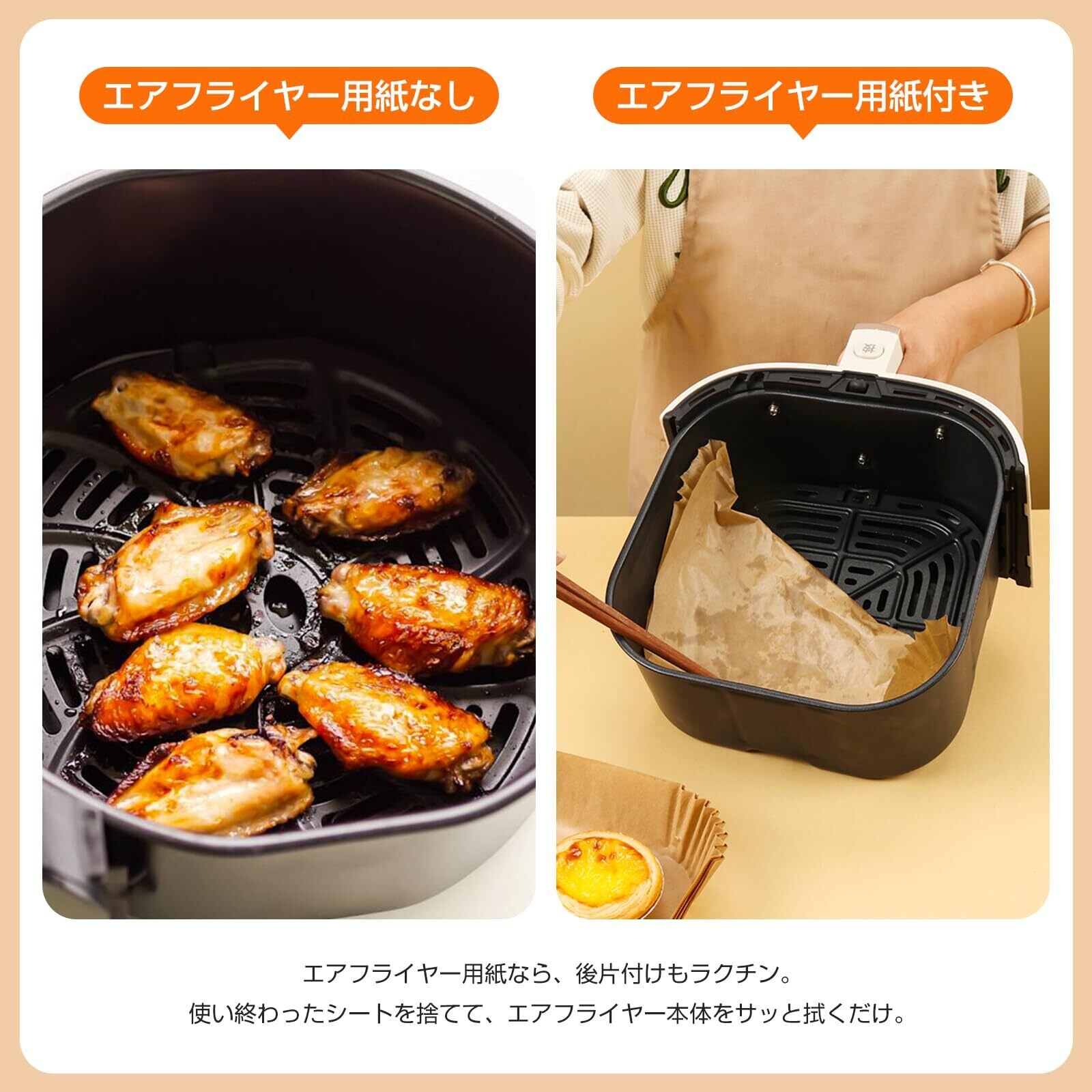 【使い捨てで後片付けが驚くほど楽に】CCYCCLエアフライヤー用紙を使え、調理後はペーパーを捨てるだけ。エアフライヤーのバスケットや調理器具が油や食材の残りカスで汚れるのを防ぎ、面倒な洗い物から解放します。水や洗剤の節約にもなり、毎日の家事効率をグンとアップさせます。