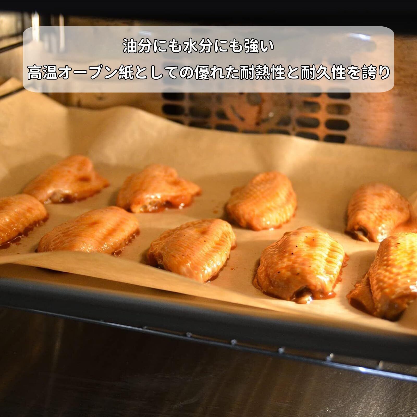 【油分にも水分にも強い】高温オーブン紙としての優れた耐熱性と耐久性を誇り、オーブンシートや食品包装、惣菜の敷き紙としても便利です。