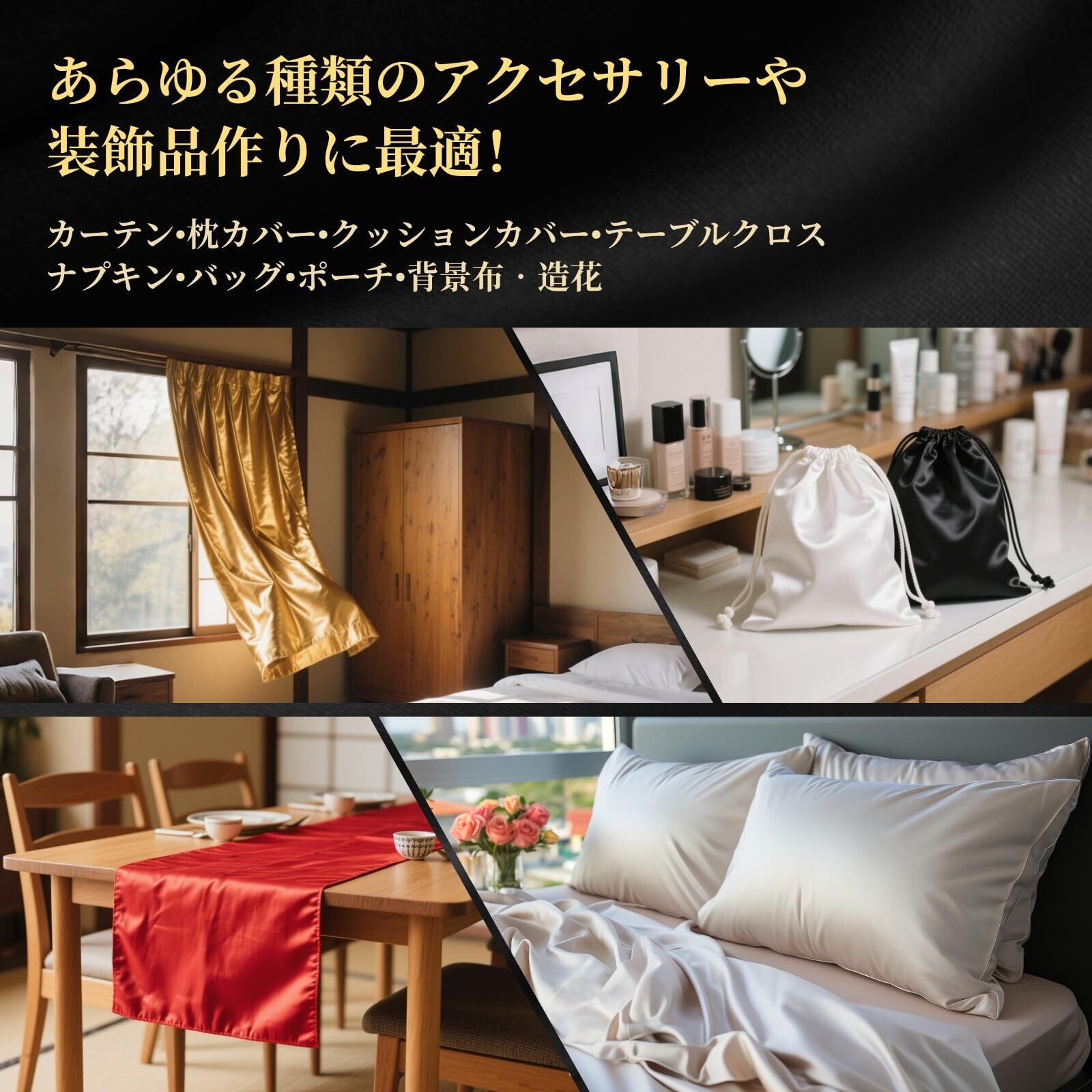 幅広い用途。ウェディング、パーティ、お祭り、婦人服、衣装、ブラウス、スカート、ドレス、ナイトウェア、スカーフ、ネクタイ、リボン、装飾品、裏地、枕カバー、カーテン、クッションカバー、テーブルクロス、ナプキン、カバー、バッグ、ポーチ、ディスプレイ、背景布、造花、コスプレ、人形、工芸品、学校行事等。