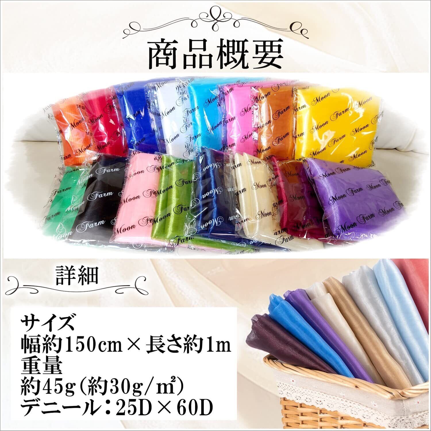 美しい光沢のスタンダードオーガンジです。幅約:1m×1.5m 重量:45g(1㎡約30g) 糸の太さ:25D×60D(デニール)