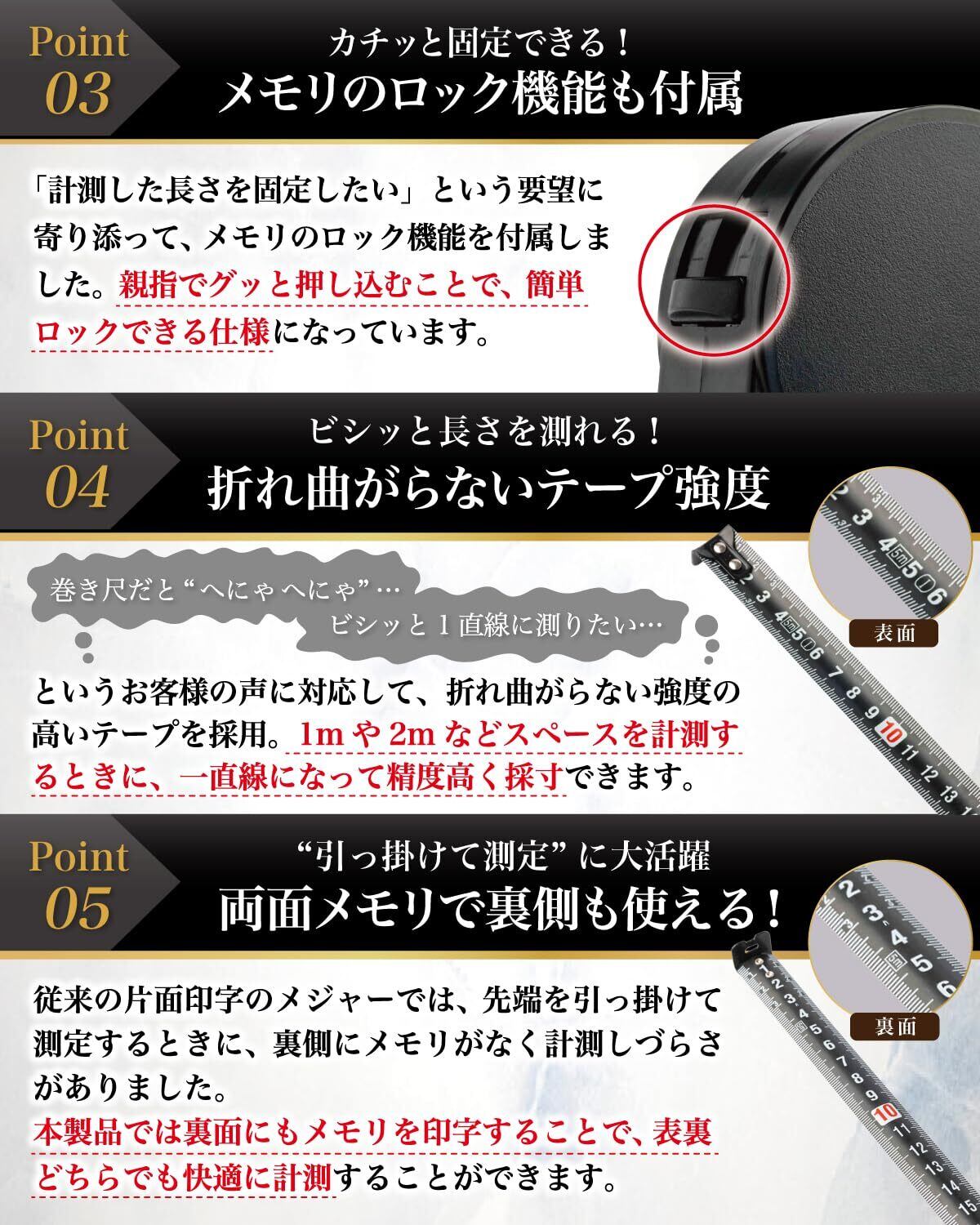 【こだわりポイント】 下記の[1~[5]のポイントにこだわりを持って、 工場様との規格調整を進めさせて頂きました。 [1] 直径6cmでコンパクト収納 [2] 折れ曲がらないからビシッと測れる [3] 黒基調で読みやすいテープ [4] 両面メモリで裏側でも数字が見える [5] ロック機能で測定しやすい