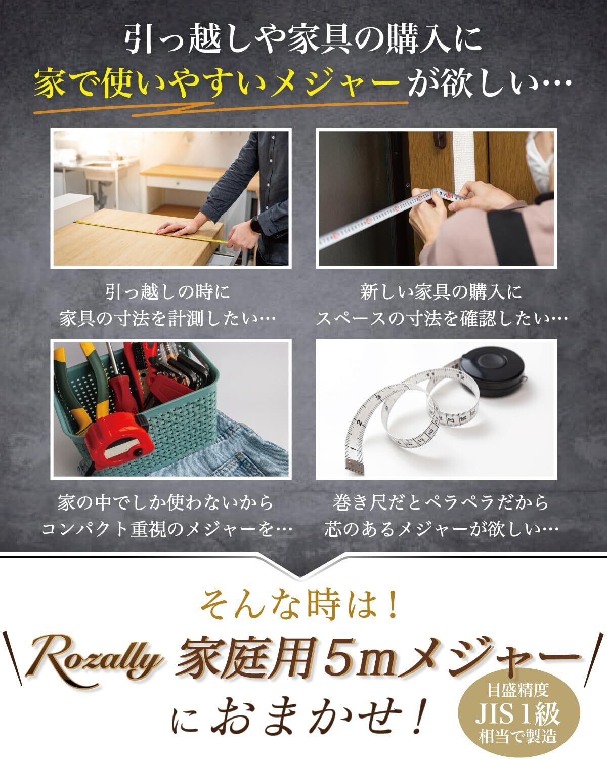【家具やスペースの計測に!】 Rozally 家庭用 5mメジャー ( 巻き尺 ) がついに正式販売開始。 「引越しに家具を購入するため」「折れ曲がらないメジャーが欲しい」という お客様に人気の 直径6cmのコンパクト メジャー です。 「使う頻度は少ないからコンパクトで…」「ロック機能があると嬉しい…」 そんなお客様の声から生まれたビシッと1直線に測定できる家庭用メジャーです。