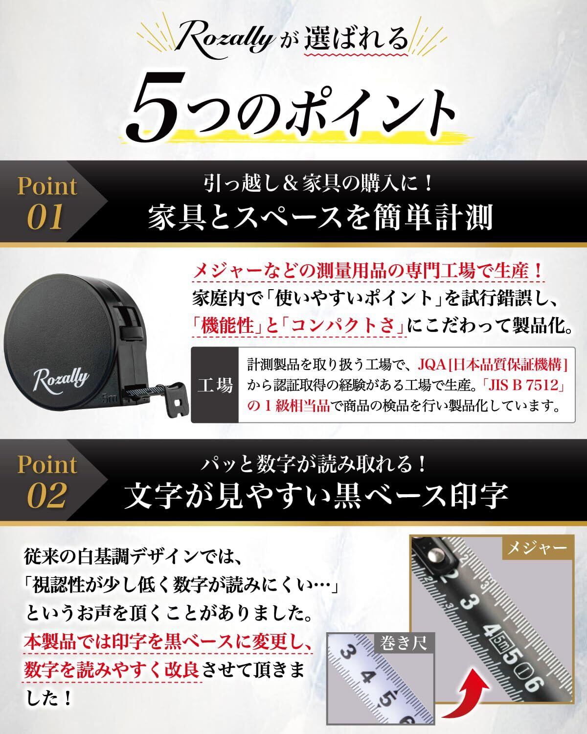 【商品の開発について】 様々なから DIY 用品として ” 家庭用メジャー ”や” 巻尺 ”など 日本製/中国製など様々に販売されていますが、 Rozallyの メジャー は”こだわり”が一味違います。 「JQA(一般財団法人日本品質保証機構)」にて品質認証を受けたことがある工場で、 「JIS B 7512 1級相当品」である規格で製造しています。