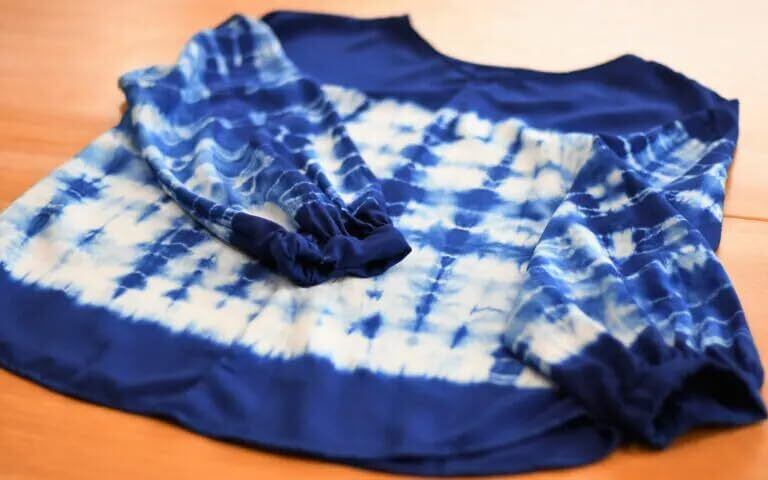 (4)染めた温度より低い温度のお湯の中に放置して冷ました後、お湯で軽く洗う。中性洗剤を入れてさらに軽く洗い、水ですすいでから、かげ干しをする。
