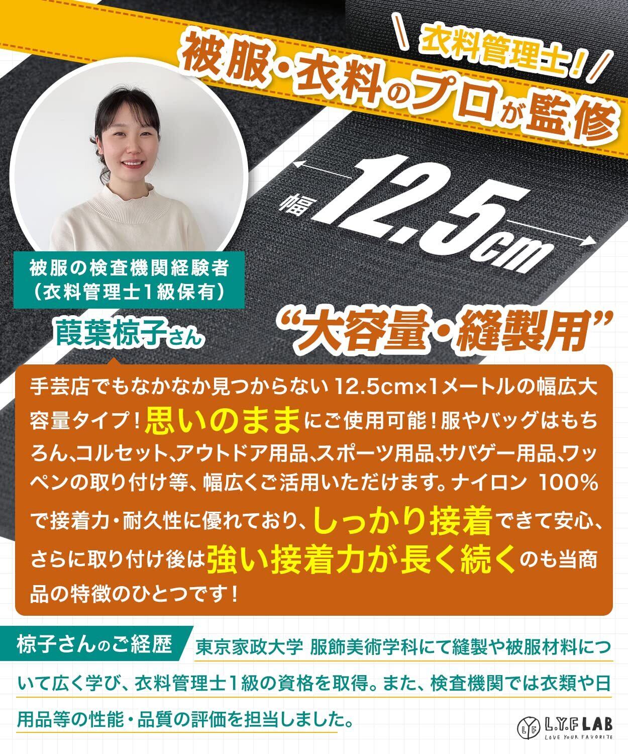 【 幅広大容量!洗濯機OK! 】 専門店でもなかなか見つからない「 幅12.5cm×長さ100cm 」の大容量タイプ!お好みのサイズや形にハサミでカットしご使用いただけます!裏面糊なしの縫製用(縫い付け用)・手芸用の面ファスナーとなります!ミシンや洗濯機でのご使用も可能です!※洗濯機をご使用の際はネットへ入れ、テープ同士を貼り合わせ閉じた状態で洗濯機へお入れください。ゴミの付着や劣化を防止し、より長く快適にご使用いただけます。
