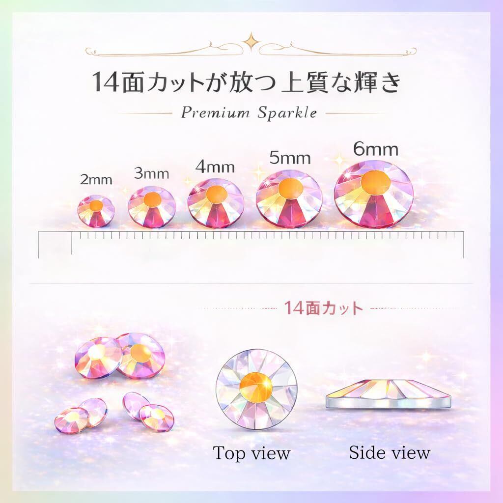 本製品はレジン製ながら、ガラスストーンに近い輝きを実現する14面カット加工を採用。 半球状カットにより、光を多方向に反射し、キラキラとした美しい輝きを放ちます。 ※入荷時期により、お色味に若干の差異や個体差が生じる場合がございます。 ※グラム計量のため、ストーンの入り数は記載の数量から多少前後する場合がございます。