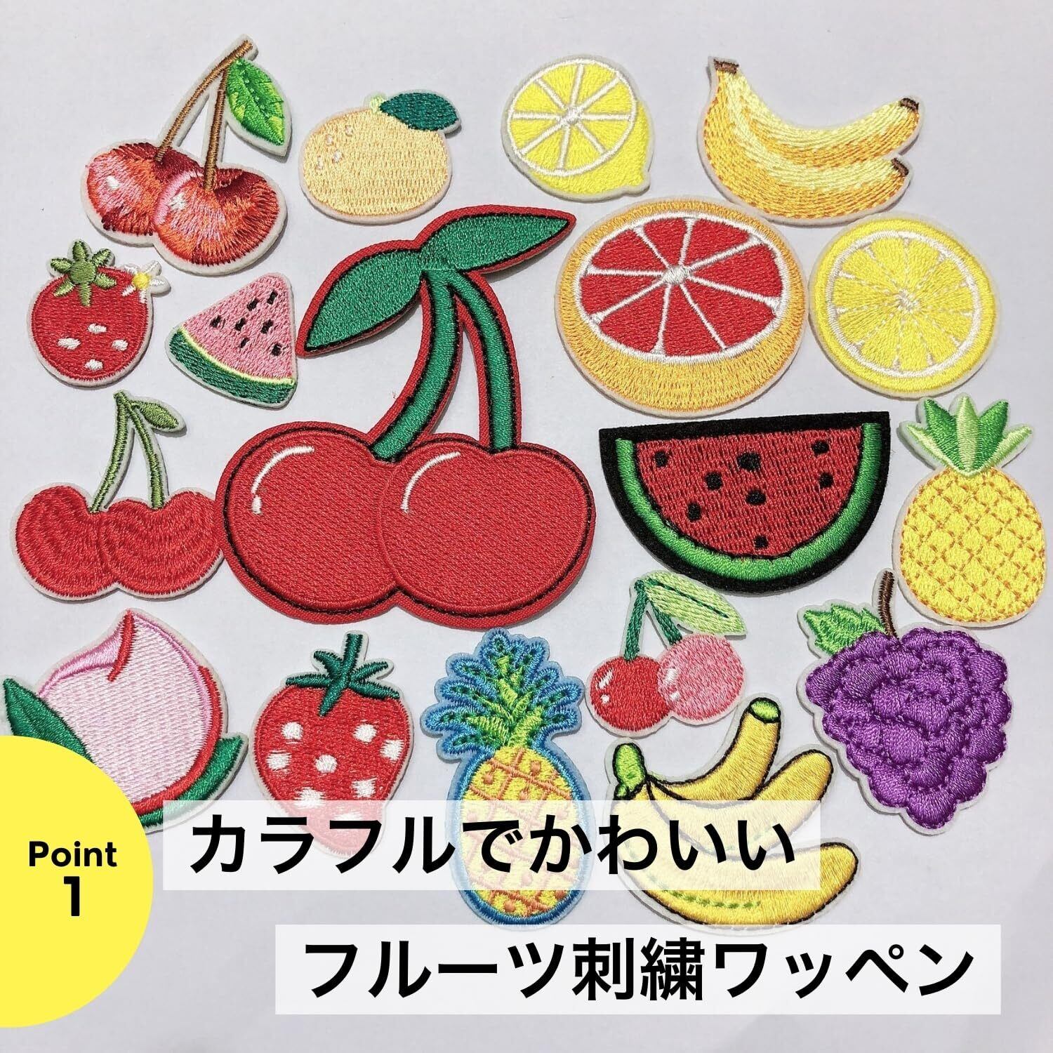 【サイズ・バリエーション】小さめサイズのフルーツ刺繍ワッペン5枚セットです。ぶどう、桃、サクランボ、グレープフルーツ、レモン、パイナップル、オレンジ、スイカ、バナナ、リンゴ、ブルーベリーなどのカラフルなデザインで、子ども服や小物にぴったりです。