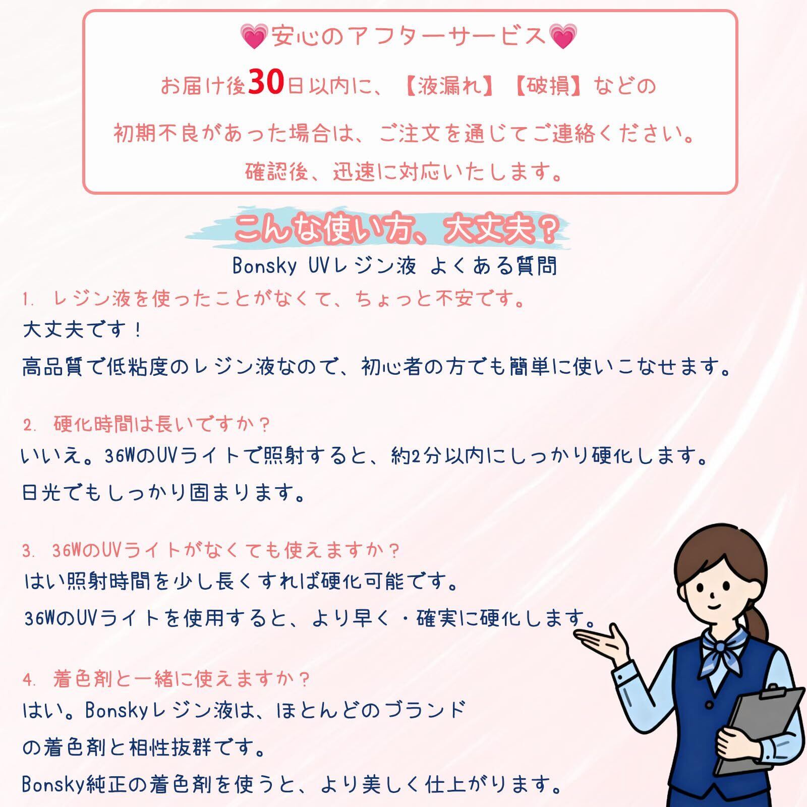 ブランド・セット内容・保証:Bonskyとボンスキーはいずれも当社が展開するブランドです。日本向け商品は「ボンスキー」表記となります。【内容】UVレジン液125g×2、細口ノズルキャップ×2、アルミ封止オープナー×1。液漏れや付属品不足がございましたら、ご注文履歴よりご連絡ください。24時間以内に対応し、購入日より間の保証付きです。