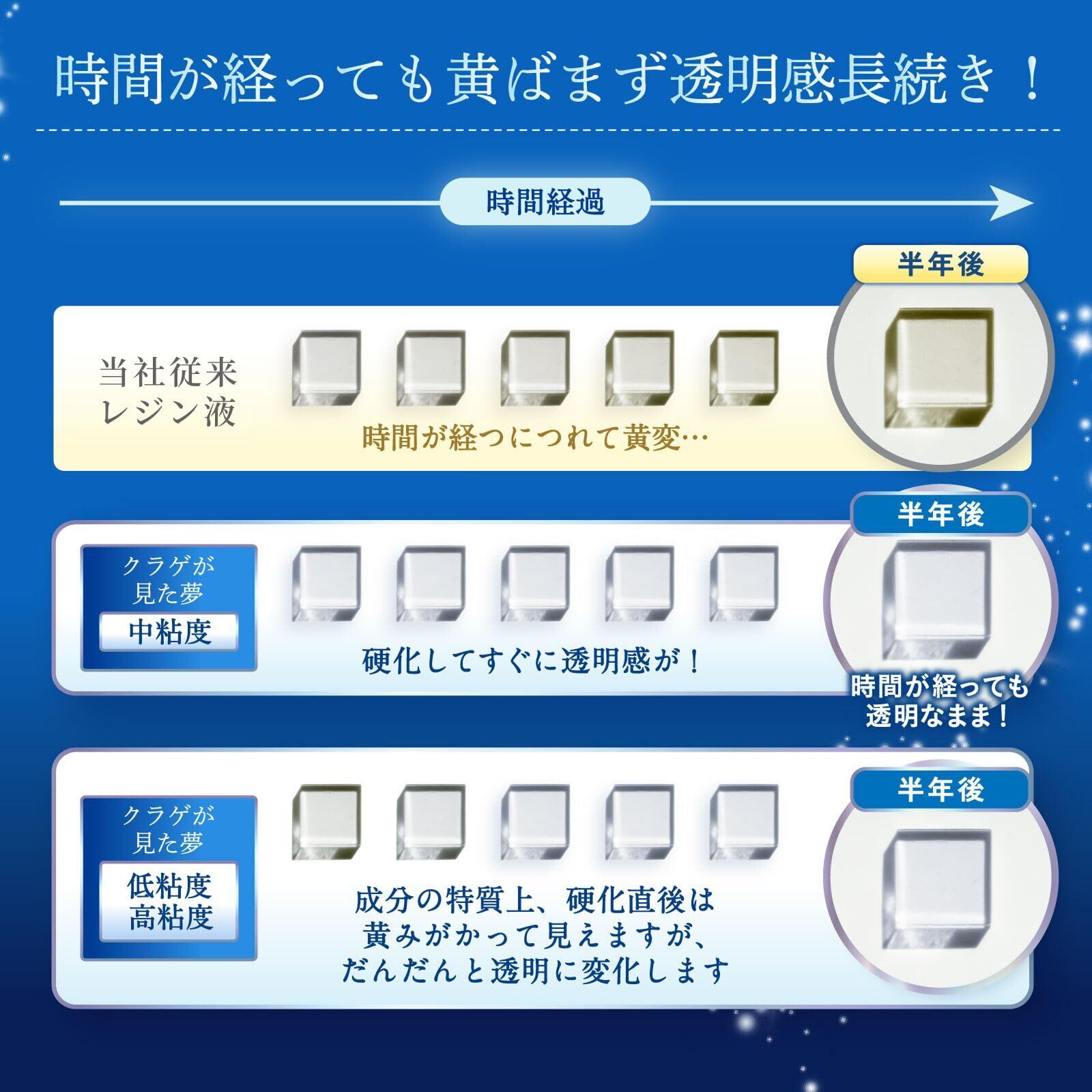 【まるでガラスのような透明度!黄変しにくく美しさ長持ち】 黄変しにくい成分が配合されているので、ガラスのようにクリアな透明度を長期間キープすることが出来ます!シリコンモールドを使用してもシワが寄りにくく美しい仕上りに初心者の方からレジン作家さんまで幅広くおすすめできる高品質なレジン液です。
