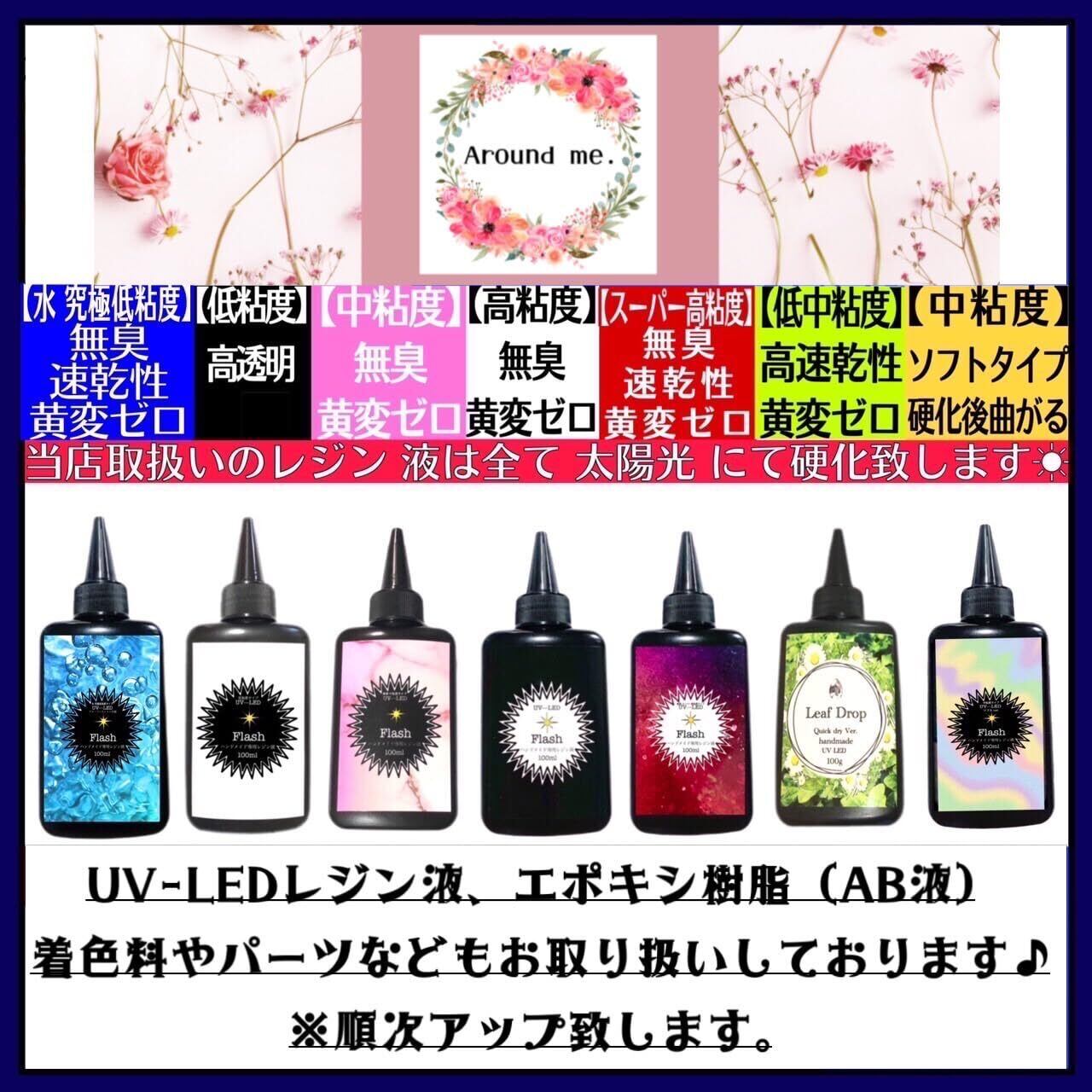 Flash(フラッシュ)シリーズ 中粘度レジン液(ソフトタイプ)グミ感覚のレジン液 ※硬化後やわらかいタイプになります ✼┈┈┈┈┈┈┈┈┈┈┈┈┈┈✼ 【ソフトレジン 液】【黄変ゼロ】 ※硬化後、曲げたりプニプニしたりできます ※硬化後、少し黄みが見られる場合が ございますが、時間が経てば経つほど 綺麗な透明に変化します ✼┈┈┈┈┈┈┈┈┈┈┈┈┈┈✼ UV-LEDライト・UVライト 大陽光にて硬化できます 太陽が降り注ぐ屋外イベントや 照明が強い室内イベントでも ず〜っと黄変しないNewレジン液(*´∇`*) ✼┈┈┈┈┈┈┈┈┈┈┈┈┈┈┈┈✼ ︎太陽光でも硬化する為 日当たりの良いお部屋(窓辺)では 光を遮ってからの作業がおススメ ※作業中に固まる可能性アリ( ;´Д`) ✼┈┈┈┈┈┈┈┈┈┈┈┈┈┈┈┈✼ 使用できる(接着・コーティング)素材 ドライフラワー・プラスチック 金属・ガラス・紙・布 メッキ加工品・粘土(紙や樹脂)・石膏 天然石・アクリル絵の具 ※レジン用のシリコンモールドなどでの使用を想定しております。 その他の着色料や材料との相性によるクレームはお受けできません。 ご了承くださいませ。 ✼┈┈┈┈┈┈┈┈┈┈┈┈┈┈┈✼ 硬化後もやわらかいソフトタイプ グミのような作品や、お子様への ぷにぷにキーホルダーに ドライフラワーが入っていても 曲げても崩れない(´⊙ω⊙`) 着色剤を多めに入れると ぷにぷに感が増します(о´∀`о) 100g大容量なのでたくさん作ることが 出来ますので、失敗しても大丈夫 ✼┈┈┈┈┈┈┈┈┈┈┈┈┈┈┈✼ 硬化時間 ライト照射より約3分で硬化‼️ 【例】モールド使用・厚み2センチの作品 製作時硬化時間の目安 UV-LEDライト使用→約3分 UVライト使用→約5分 太陽光→約10分 ✼┈┈┈┈┈┈┈┈┈┈┈┈┈┈┈┈✼ ついつい触りたくなるぷにぷに感触 ツルツルの面ですが、ゴム素材や シリコンのような質感となっております ※硬化後は熱を持っておりますので 冷めてから触れていただきますよう お願い致します(>人<;) 是非一度、お試しいただければ 嬉しいです(⌯˃̶᷄ ⁻̫ ˂̶᷄⌯)〰 ✼┈┈┈┈┈┈┈┈┈┈┈┈┈┈✼ ※現在ラベルは2枚目の写真となっております。