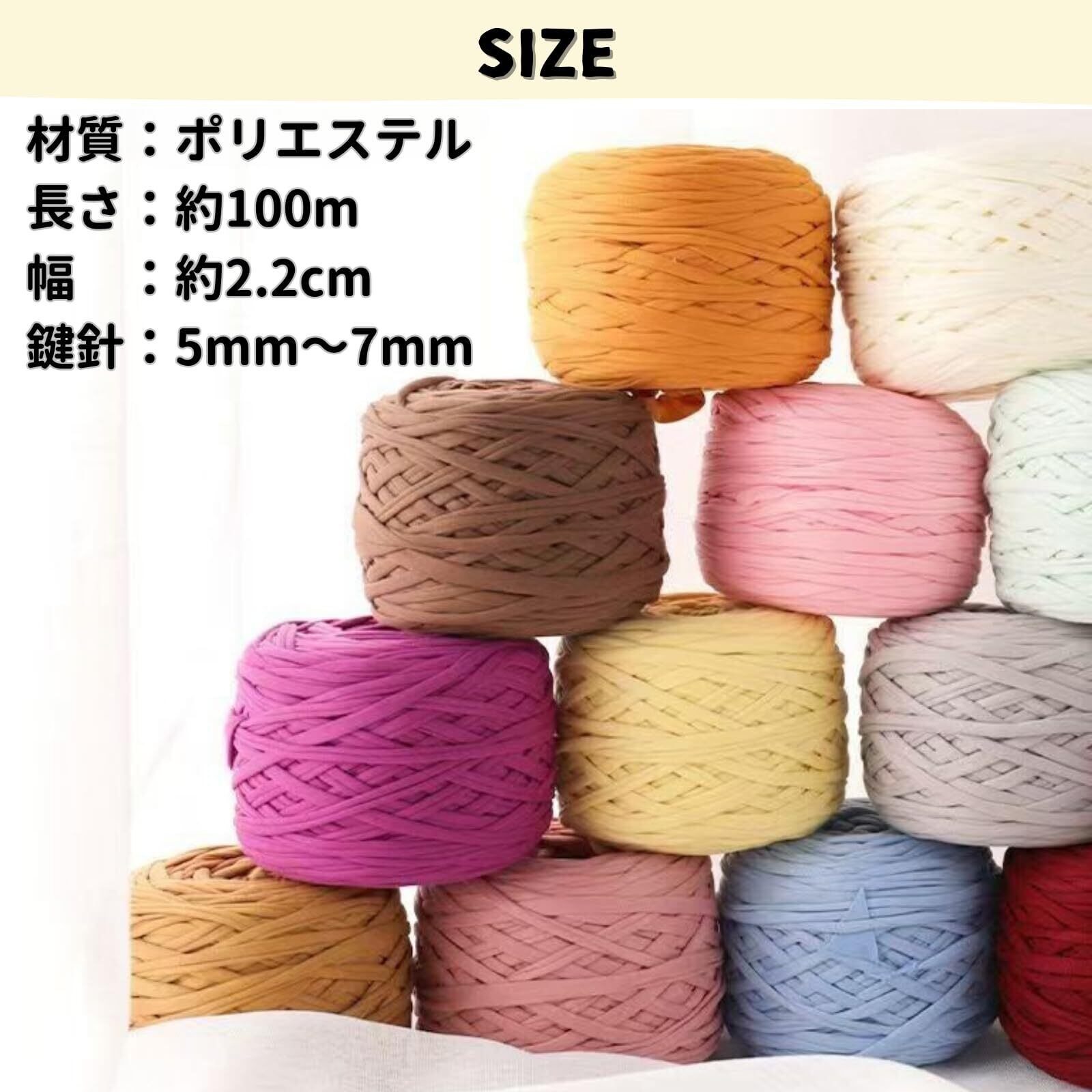 【商品詳細】<Tシャツヤーン 1個>長さ:約100m。幅:2.2cm。5mm~7mm(8/0号~10/0号)のかぎ針用。*誤差はあります