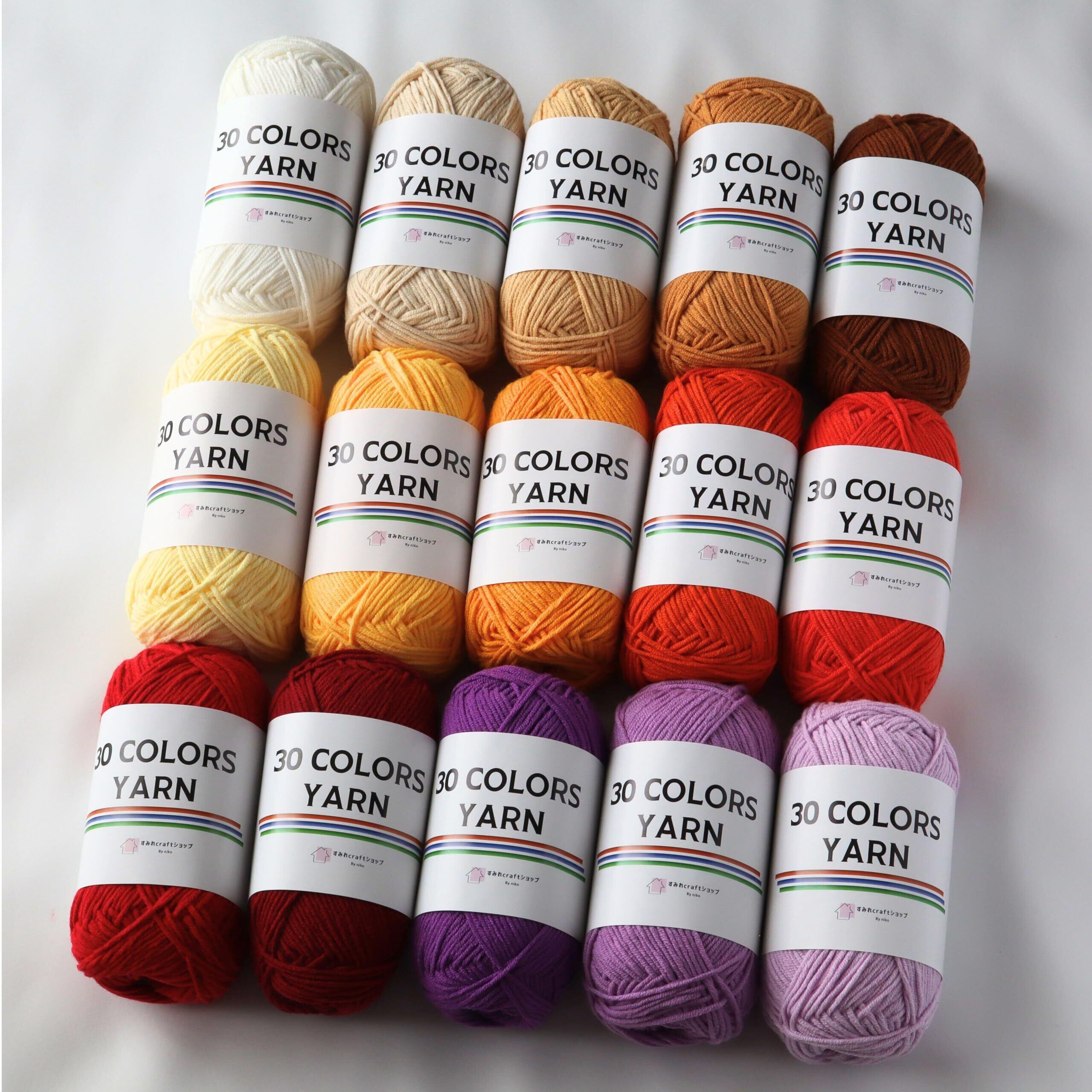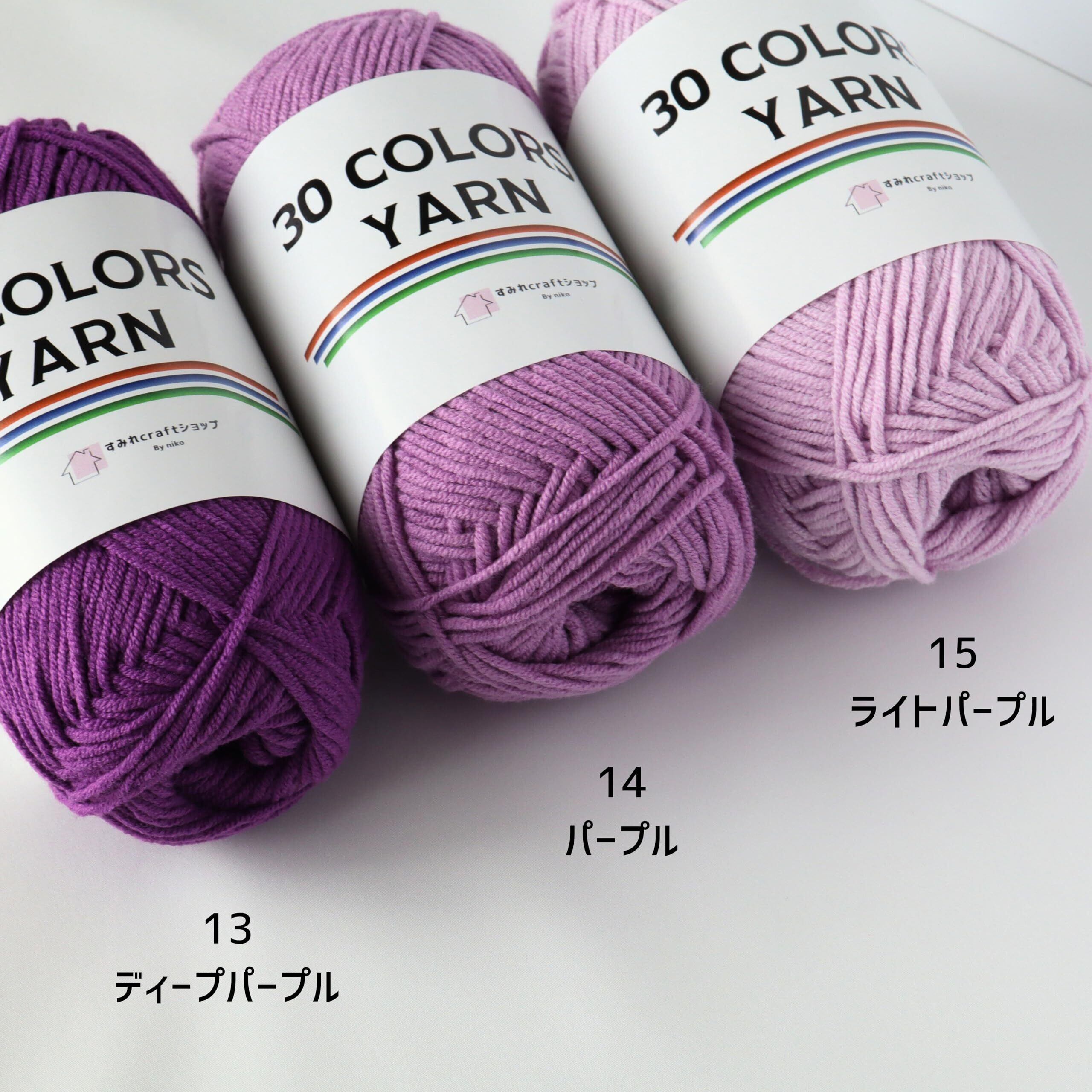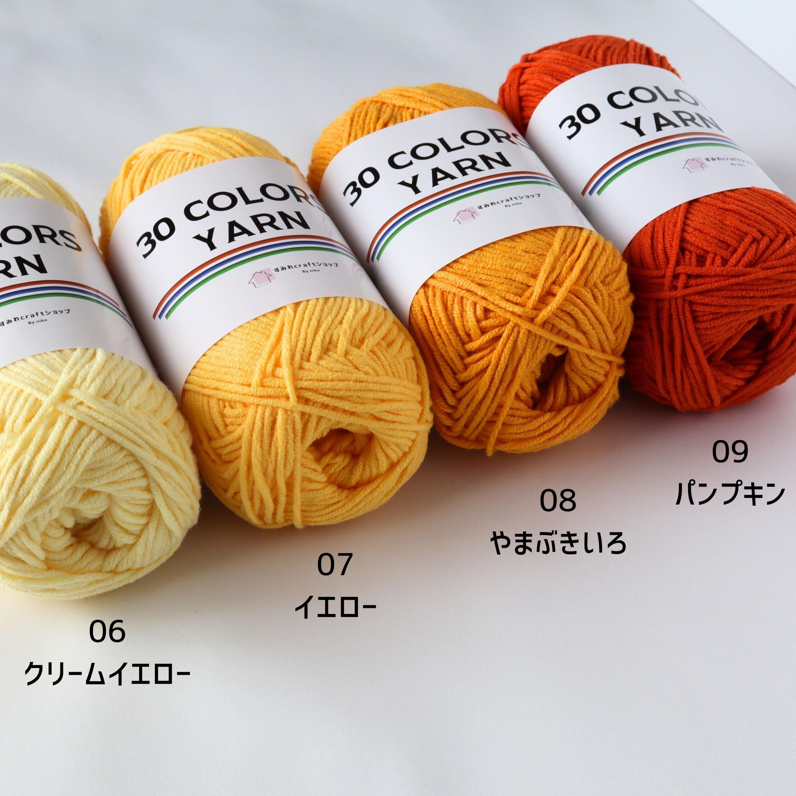30 COLORS YARNはコットン60%、アクリル40%の毛糸です。一玉50g、約120m(合太程度)です。コットン混の糸ですが編みやすく、カラーも全30種類と豊富です! ウールが苦手な方、あみぐるみやモチーフ編みなどにおすすめです。やわらかく肌触りもいい糸で糸割れもしにくく、扱いやすい糸です。